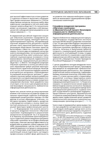 В статье проведен анализ теоретических и практических аспектов проблемы внедрения в процесс обучения бакалавров специальности «Библиотечноинформационная деятельность» технологии «Обучение служением», ставшей с 2024 г. обязательной образовательной программой в вузах страны. Актуальность исследования, представленного авторами, определяется неразработанностью инструментов внедрения этой технологии в образовательный процесс конкретного направления обучения в вузе.