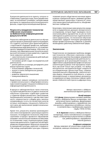 Результаты наблюдения за деятельностью студентов в ходе проектной работы показали, что обозначенная технология имеет высокий потенциал для развития профессиональных компетенций будущих специалистов библиотечного дела, если ее внедрение в практику обучения основано на главных требованиях к профессиональной модели специалиста, в том числе и специалиста библиотечного дела, а также если при разработке методического инструментария будут учтены главные принципы образования в высшей школе. Практическая значимость статьи состоит в приведении набора рекомендаций для внедрения технологии «Обучение служением» в других вузах и для других направлений подготовки.