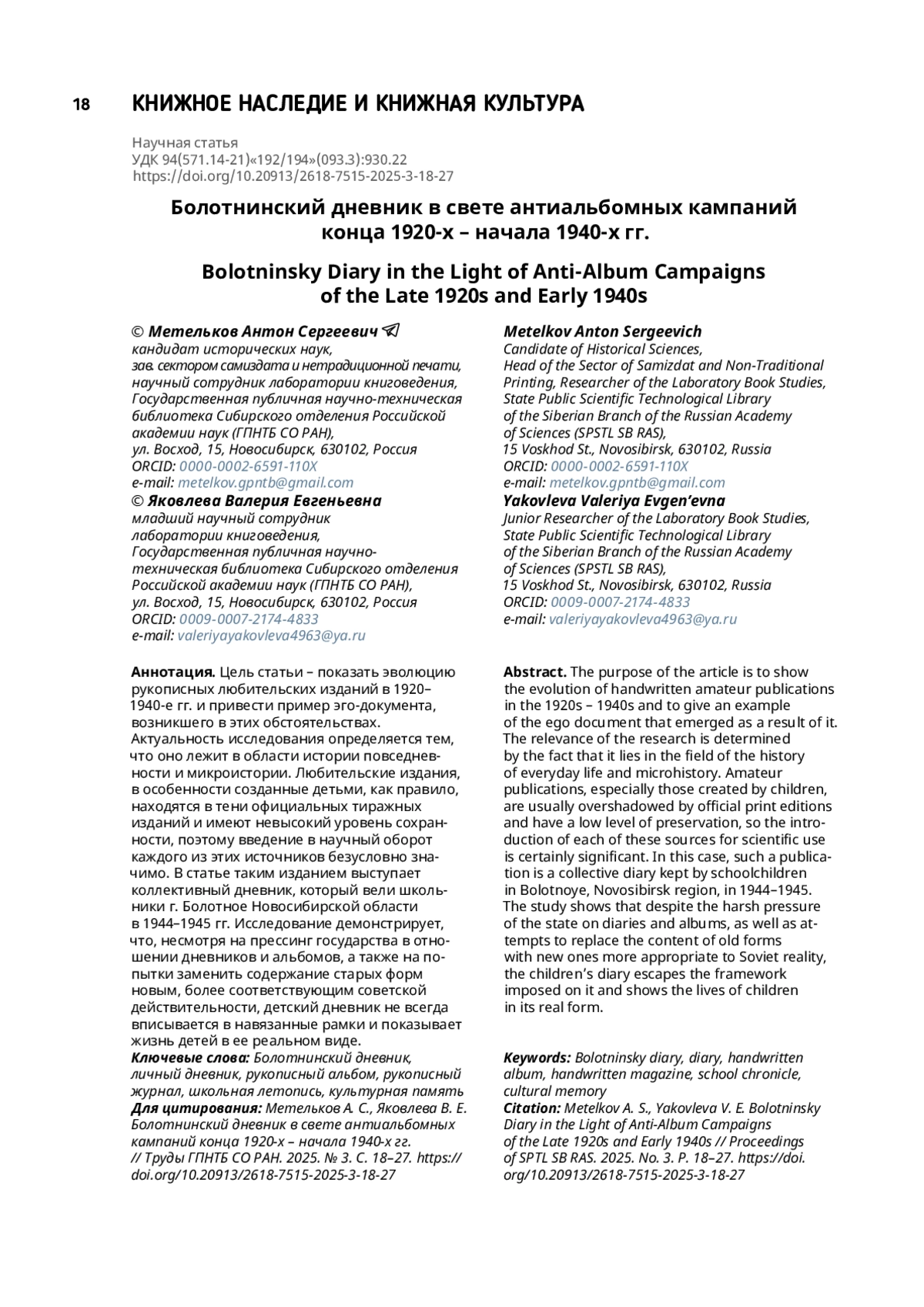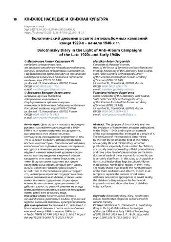Цель статьи – показать эволюцию рукописных любительских изданий в 1920–1940-е гг. и привести пример эго-документа, возникшего в этих обстоятельствах. Актуальность исследования определяется тем, что оно лежит в области истории повседневности и микроистории. Любительские издания, в особенности созданные детьми, как правило, находятся в тени официальных тиражных изданий и имеют невысокий уровень сохранности, поэтому введение в научный оборот каждого из этих источников безусловно значимо. В статье таким изданием выступает коллективный дневник, который вели школьники г. Болотное Новосибирской области в 1944–1945 гг. Исследование демонстрирует, что, несмотря на прессинг государства в отношении дневников и альбомов, а также на попытки заменить содержание старых форм новым, более соответствующим советской действительности, детский дневник не всегда вписывается в навязанные рамки и показывает жизнь детей в ее реальном виде.