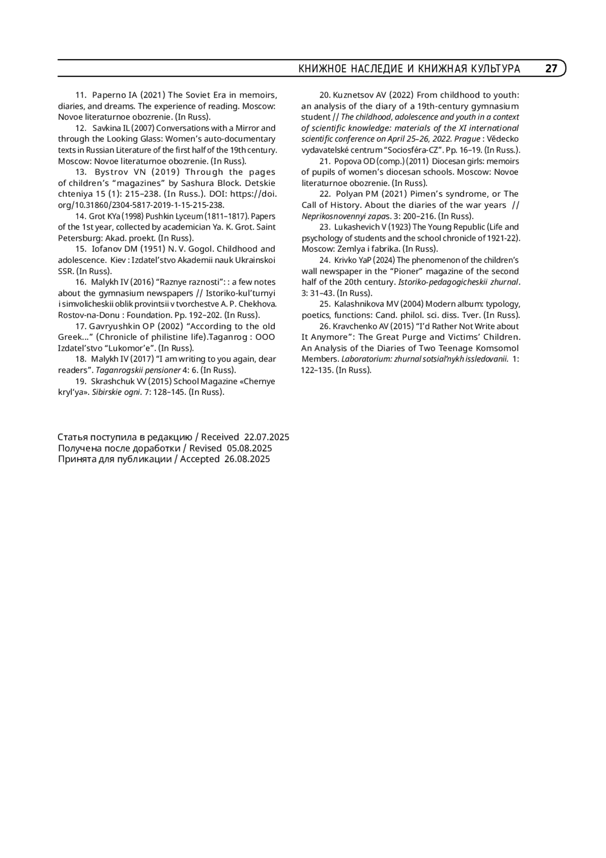 24. Кривко Я. П. Феномен детской стенгазеты в журнале «Пионер» второй половины 20-х годов XX века // Историко-педагогический журнал. 2024. № 3. С. 31-43.