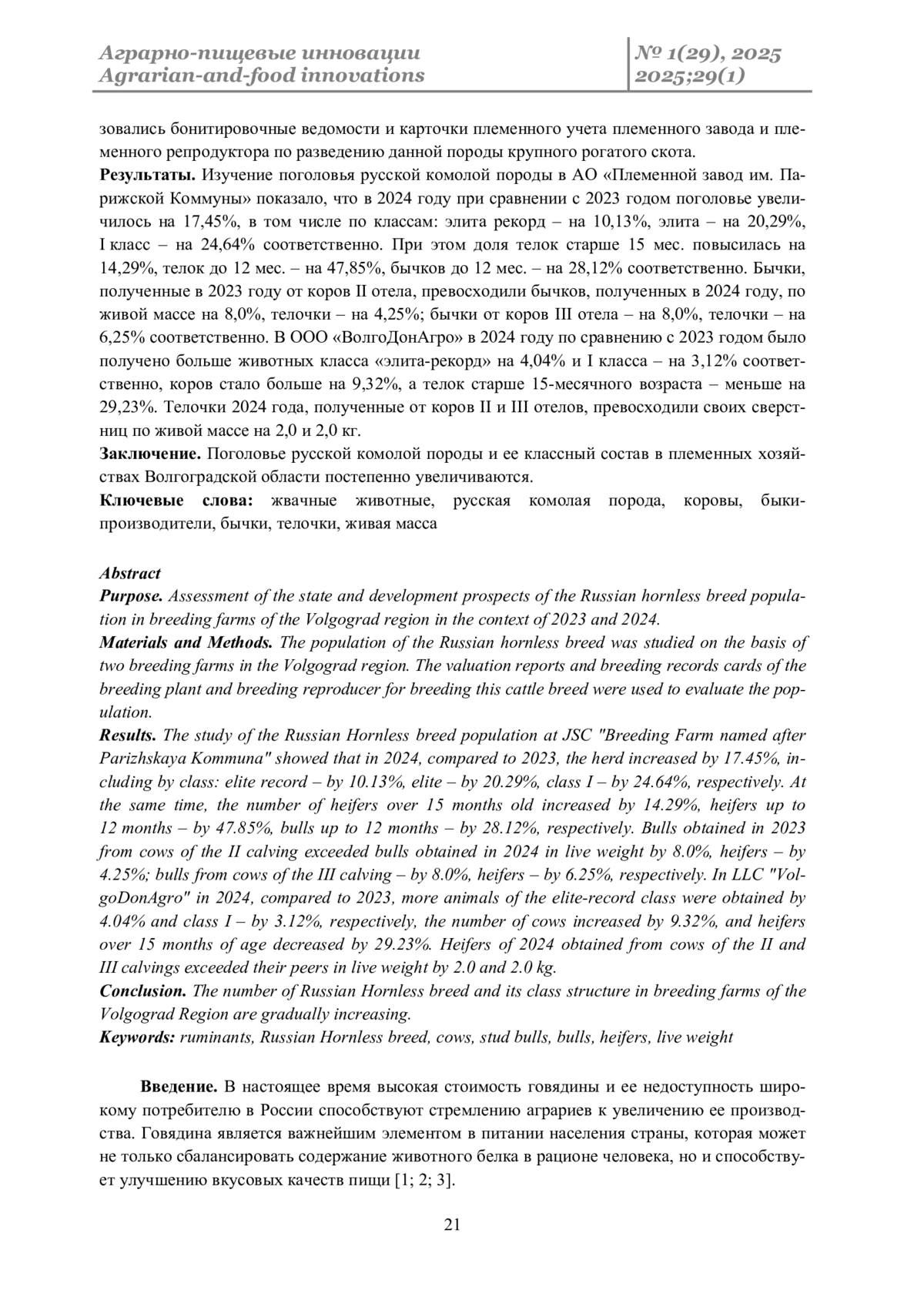 Цель. Оценка состояния и перспектив развития поголовья русской комолой породы в племенных хозяйствах Волгоградской области в разрезе 2023 и 2024 гг.