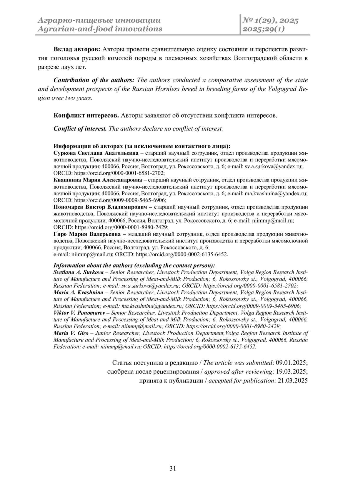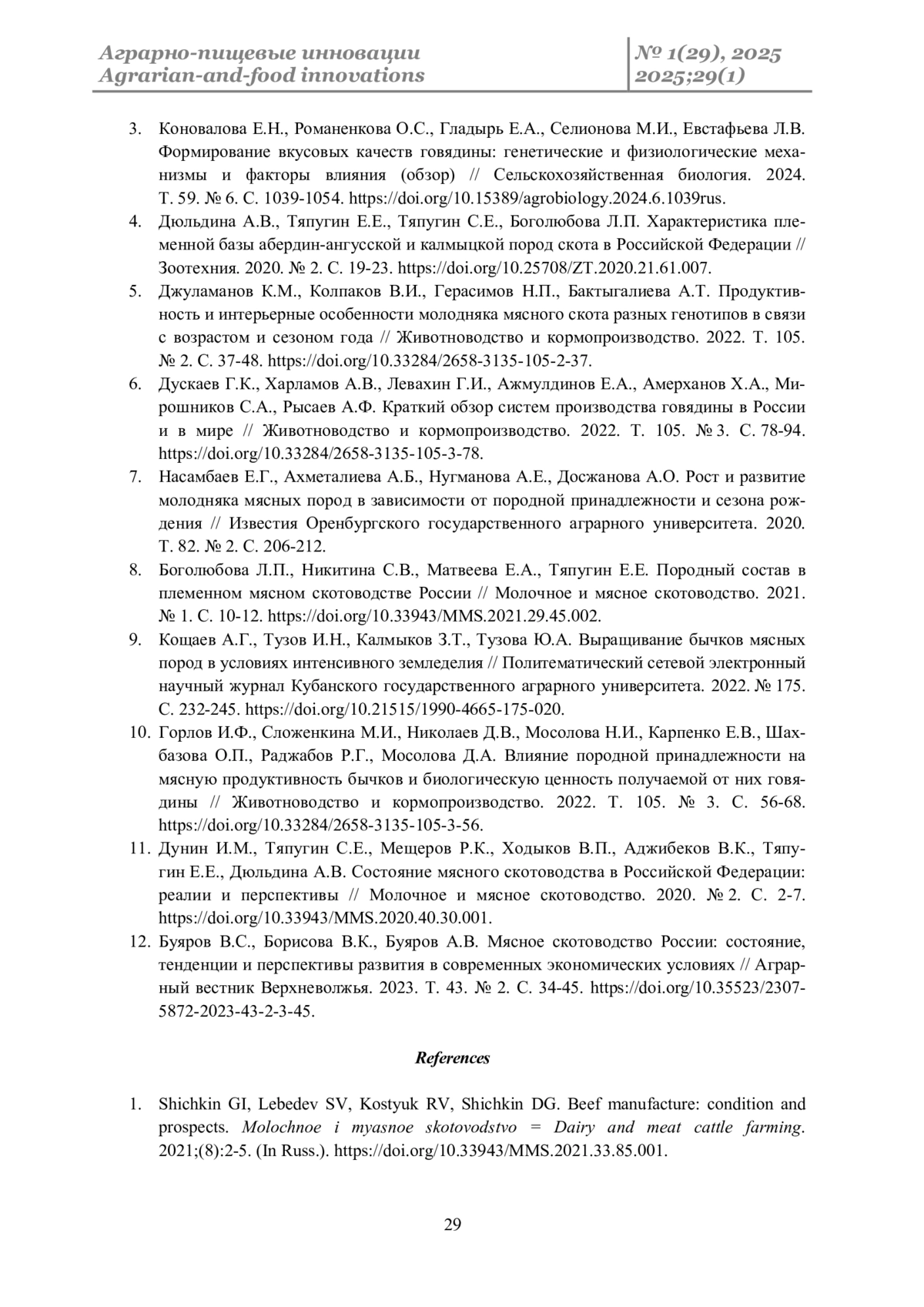 12. Буяров В.С., Борисова В.К., Буяров А.В. Мясное скотоводство России: состояние, тенденции и перспективы развития в современных экономических условиях // Аграрный вестник Верхневолжья. 2023. Т. 43. № 2C:\Users\Yuri Daniloff\Desktop\Сборники\АПИ\Журнал №29 (2025)\№ 2. С. 34-45.