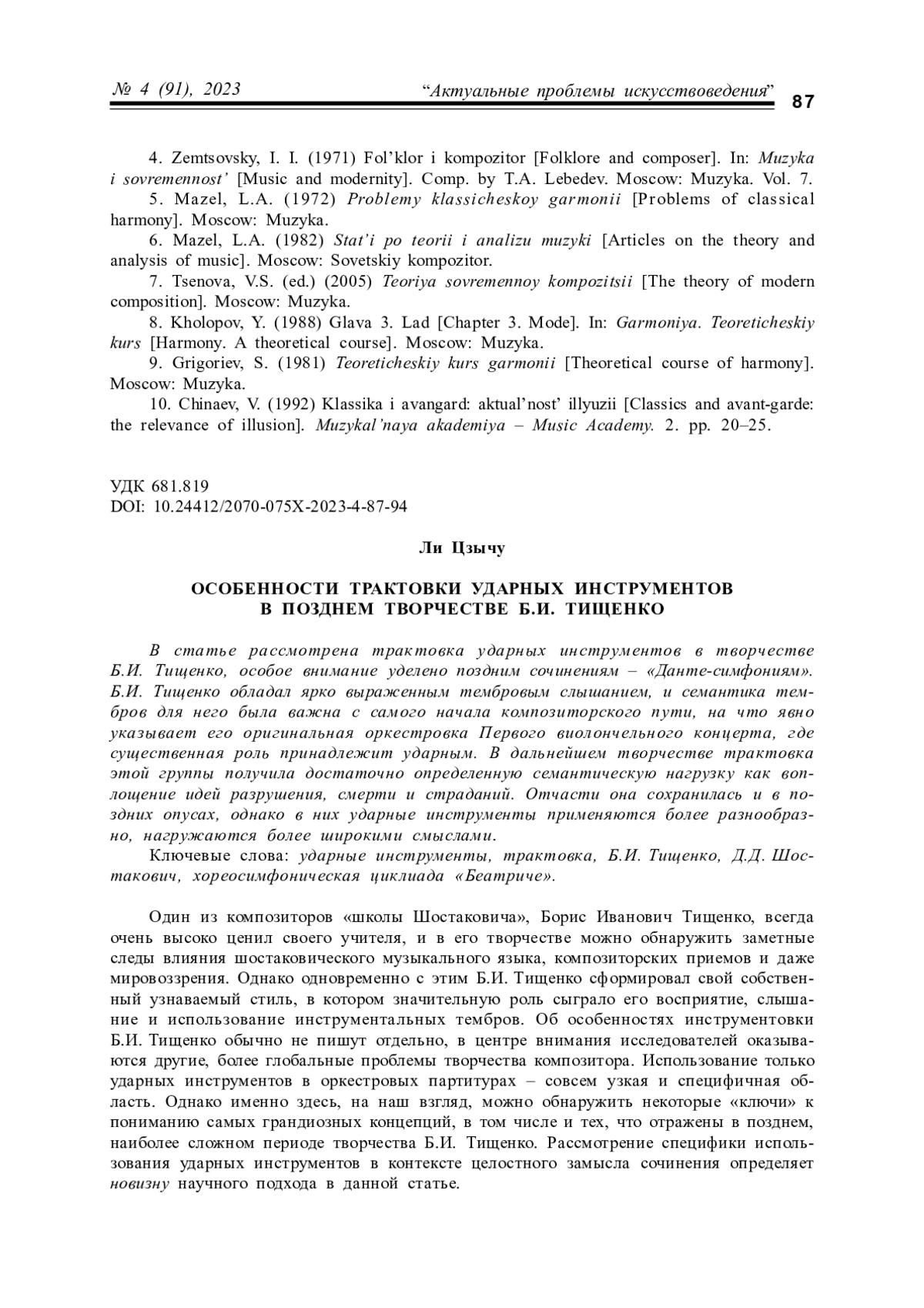 Один из композиторов «школы Шостаковича», Борис Иванович Тищенко, всегда очень высоко ценил своего учителя, и в его творчестве можно обнаружить заметные следы влияния шостаковического музыкального языка, композиторских приемов и даже мировоззрения. Однако одновременно с этим Б. И. Тищенко сформировал свой собственный узнаваемый стиль, в котором значительную роль сыграло его восприятие, слышание и использование инструментальных тембров. Об особенностях инструментовки Б. И. Тищенко обычно не пишут отдельно, в центре внимания исследователей оказываются другие, более глобальные проблемы творчества композитора. Использование только ударных инструментов в оркестровых партитурах – совсем узкая и специфичная область. Однако именно здесь, на наш взгляд, можно обнаружить некоторые «ключи» к пониманию самых грандиозных концепций, в том числе и тех, что отражены в позднем, наиболее сложном периоде творчества Б. И. Тищенко. Рассмотрение специфики использования ударных инструментов в контексте целостного замысла сочинения определяет новизну научного подхода в данной статье.