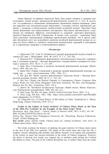 В рамках статьи осуществляется анализ творчества Чжоу Луна в контексте обновления жанровой стилистики фортепианной музыки Китая рубежа XX-XXI веков. Начиная с 1950-х годов в творчестве китайских композиторов стала заметна тенденция к воплощению в музыке народных мелодий и фольклорных элементов всех регионов и национальностей Китая. Однако стремление к развитию новых тенденций было прекращено вследствие допущенных ошибок в годы Культурной революции. Новые поколения китайских композиторов, начиная с 80-х годов XX века, были вовлечены в создание индивидуального стиля современной китайской музыки, чтобы исправить эти ошибки