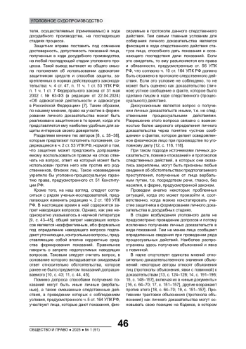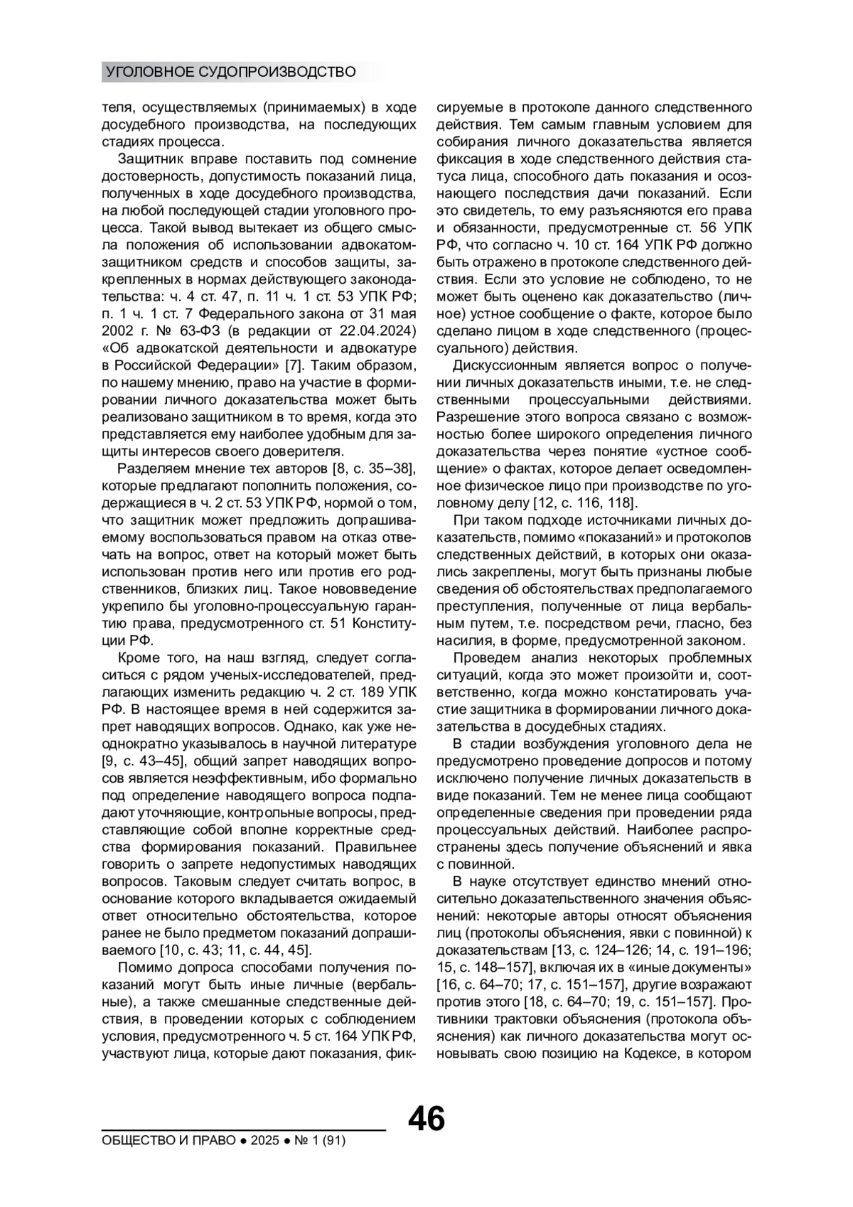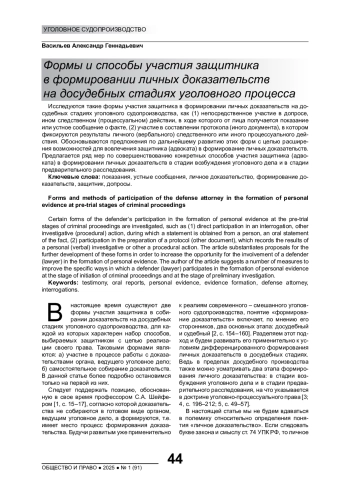 ВАСИЛЬЕВ А. Г. ФОРМЫ И СПОСОБЫ УЧАСТИЯ ЗАЩИТНИКА В ФОРМИРОВАНИИ ЛИЧНЫХ ДОКАЗАТЕЛЬСТВ НА ДОСУДЕБНЫХ СТАДИЯХ УГОЛОВНОГО ПРОЦЕССА // ОБЩЕСТВО И ПРАВО. 2025. № 1 (91)