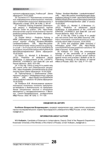 КОЛБАСИН В. В. ПРИМЕНЕНИЕ ТЕХНОЛОГИЙ ИСКУССТВЕННОГО ИНТЕЛЛЕКТА В БОРЬБЕ С СЕКСУАЛЬНЫМ НАСИЛИЕМ В ОТНОШЕНИИ НЕСОВЕРШЕННОЛЕТНИХ // ОБЩЕСТВО И ПРАВО. 2025. № 2 (92)