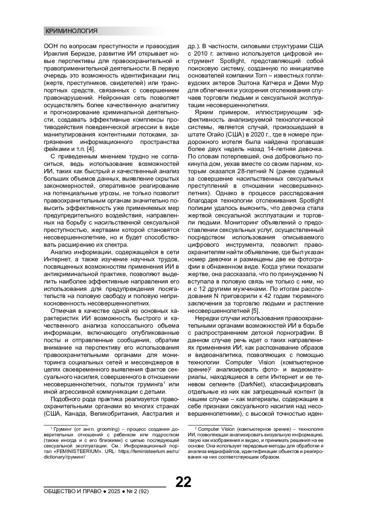 Статья: ПРИМЕНЕНИЕ ТЕХНОЛОГИЙ ИСКУССТВЕННОГО ИНТЕЛЛЕКТА В БОРЬБЕ С СЕКСУАЛЬНЫМ НАСИЛИЕМ В ОТНОШЕНИИ НЕСОВЕРШЕННОЛЕТНИХ (2025)
