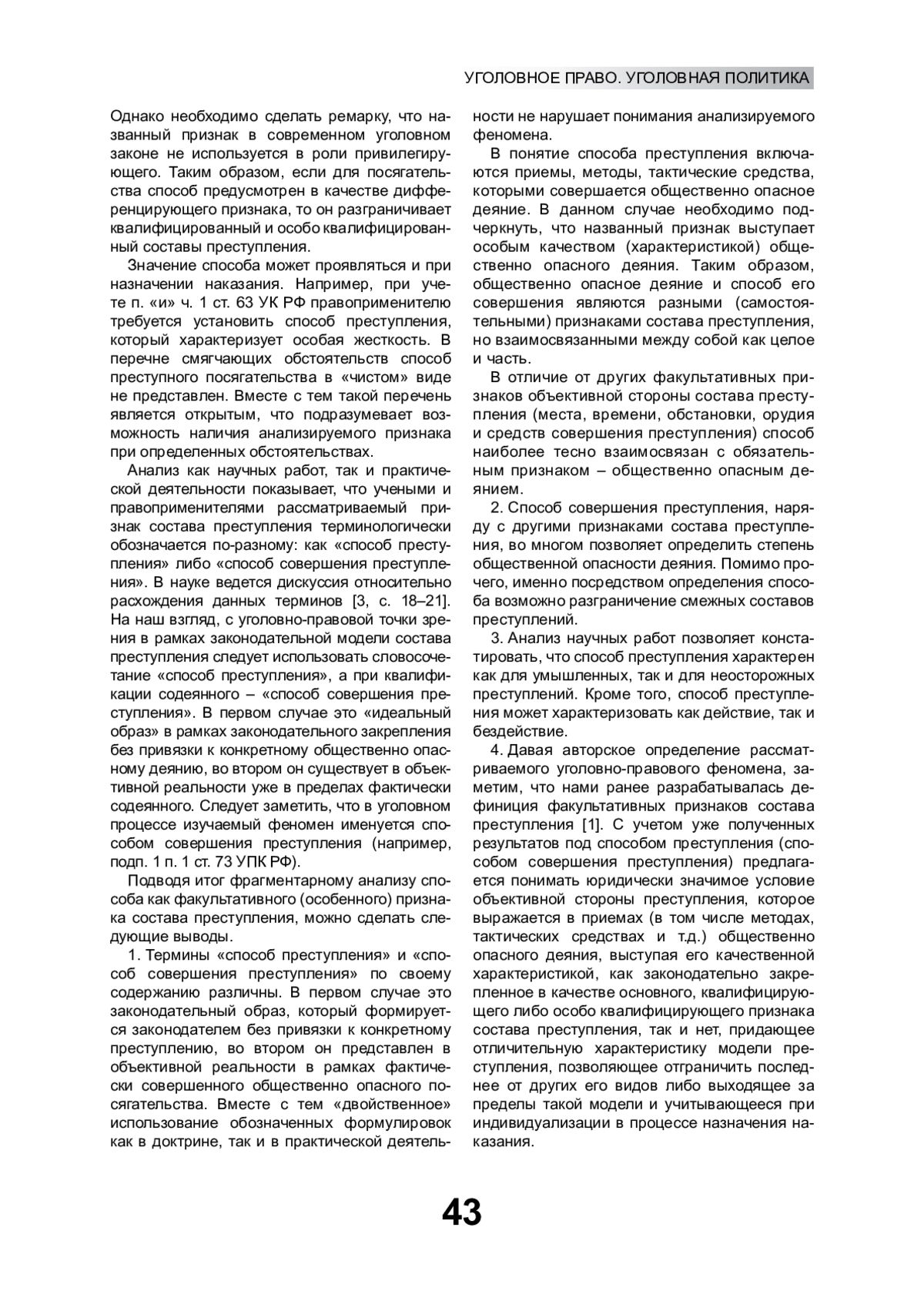 2. Шиловский С.В. Способ совершения преступления как признак уголовно наказуемого деяния и дифференцирующее средство: автореф. дис…. канд. юрид. наук. Саратов, 2014. EDN: ZPJRXZ