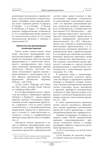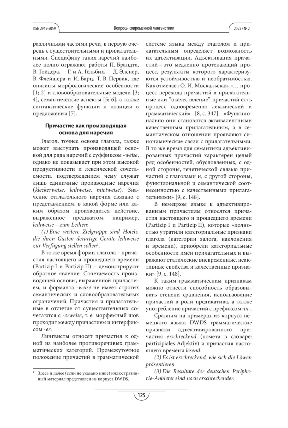 Внимание в данном исследовании сфокусировано на расхождениях в семантической интерпретации производных наречий с суффиксом -weise, образованных, с одной стороны, от причастий, а с другой стороны, от причастий, прошедших процесс адъективации и утративших морфологические признаки глагола. Анализ активных процессов в сфере образования отпричастных наречий в немецком языке, а также изучение их семантического спектра представляется актуальной и современной задачей, особенно в свете высокой продуктивности суффикса -weise в синхронном словообразовании.