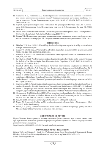 11. Алексеева А. Б., Никитина Е. А. Словообразование коллоквиальных наречий с компонентом weise в современном немецком языке // Современная наука: актуальные проблемы теории и практики. Серия: Гуманитарные науки. 2020. № 6-2. С. 102-104. DOI: 10.37882/2223-2982.2020.06-2.01 EDN: MRBFFL