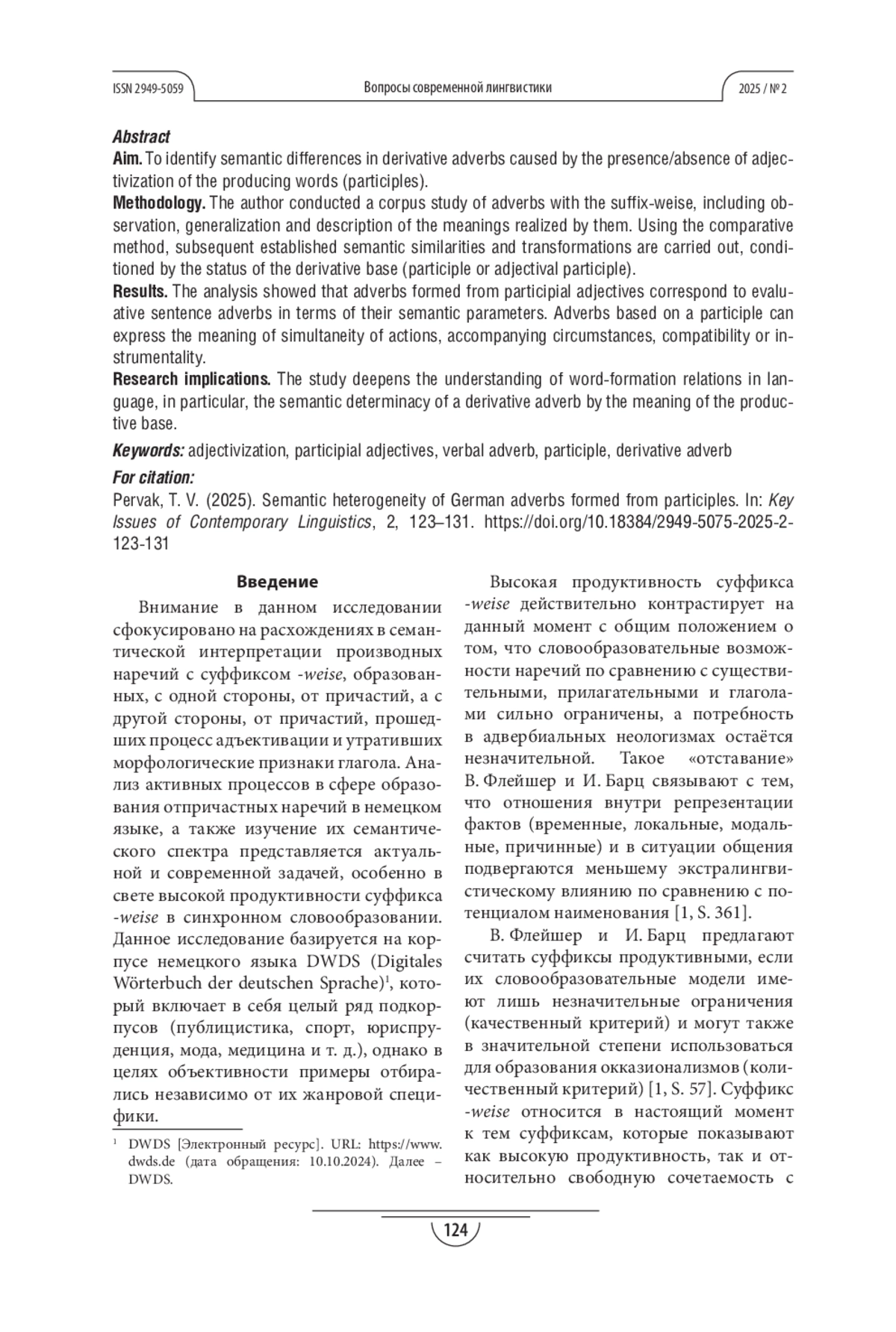 4. Первак Т. В. Словообразовательные модели отсубстантивных наречий с суффиксом -weise в немецком языке // Вестник Московского государственного областного университета. Серия: Лингвистика. 2022. № 5. С. 78-85. DOI: 10.18384/2310-712X-2022-5-78-85 EDN: ASWTRM