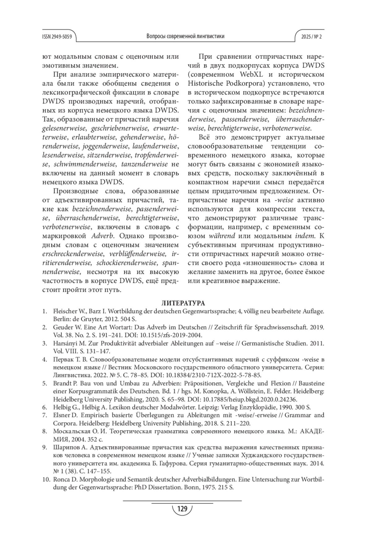 3. Harsányi M. Zur Produktivität adverbialer Ableitungen auf -weise // Germanistische Studien. 2011. Vol. VIII. S. 131-147.