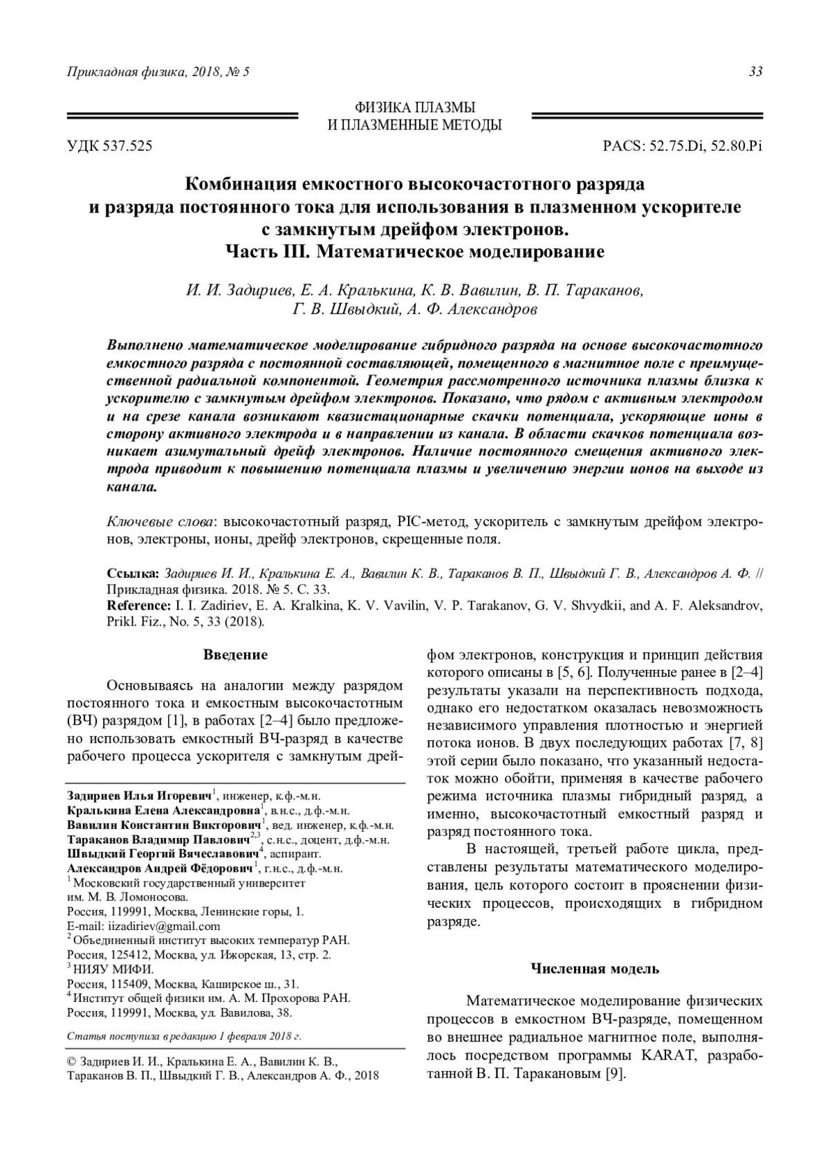 8. Задириев И. И., Кралькина Е. А., Вавилин К. В., Швыдкий Е. В., Александров А. Ф. // Прикладная физика. 2018. № 3. С. 5.