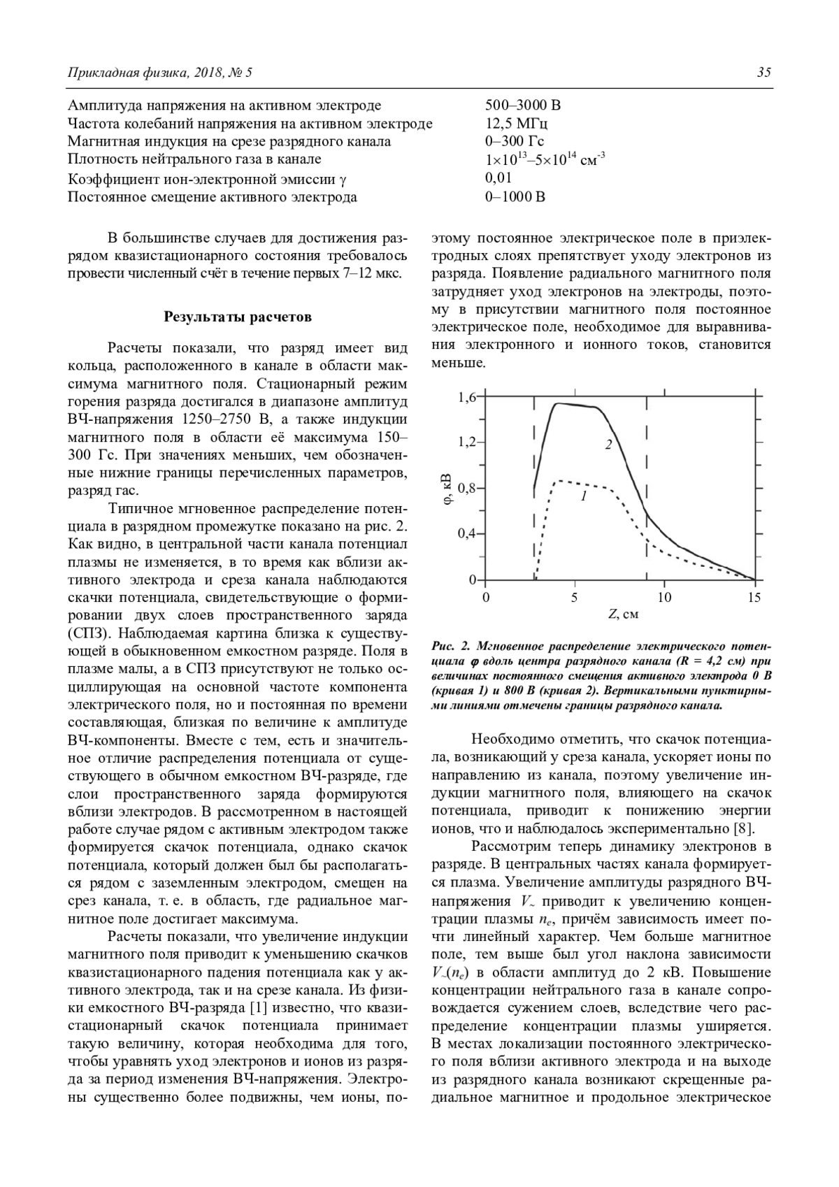 Проведённый численный счёт показал, что в емкостном высокочастотном разряде с радиальным магнитным полем и контактирующим с плазмой активным электродом формируется ускоренный поток ионов, выходящий из разрядного канала в случае его открытой геометрии. Физической причиной ускорения ионов является квазистационарный скачок потенциала, формирующийся на срезе канала, где максимальна радиальная компонента внешнего магнитного поля. Подача постоянного смещения на активный электрод, находящийся в контакте с плазмой, приводит к увеличению потенциала плазмы относительно земли и росту энергии ионов на выходе из канала. Концентрация плазмы может регулироваться изменением амплитуды ВЧ-напряжения, подаваемого на активный электрод.