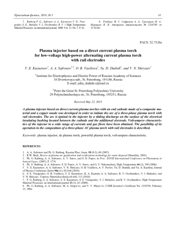 V. E. Kuznetsov, A. A. Safronov, O. B. Vasilieva, Yu. D. Dudnik, and V. N. Shiryaev Plasma injector based on a direct current plasma torch for low-voltage high-power alternating cur-rent plasma torch with rail electrodes 38