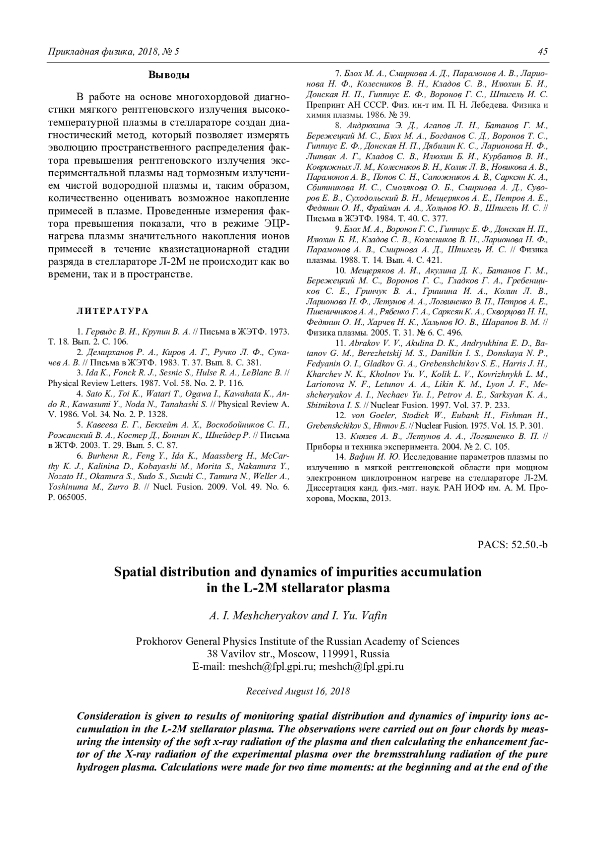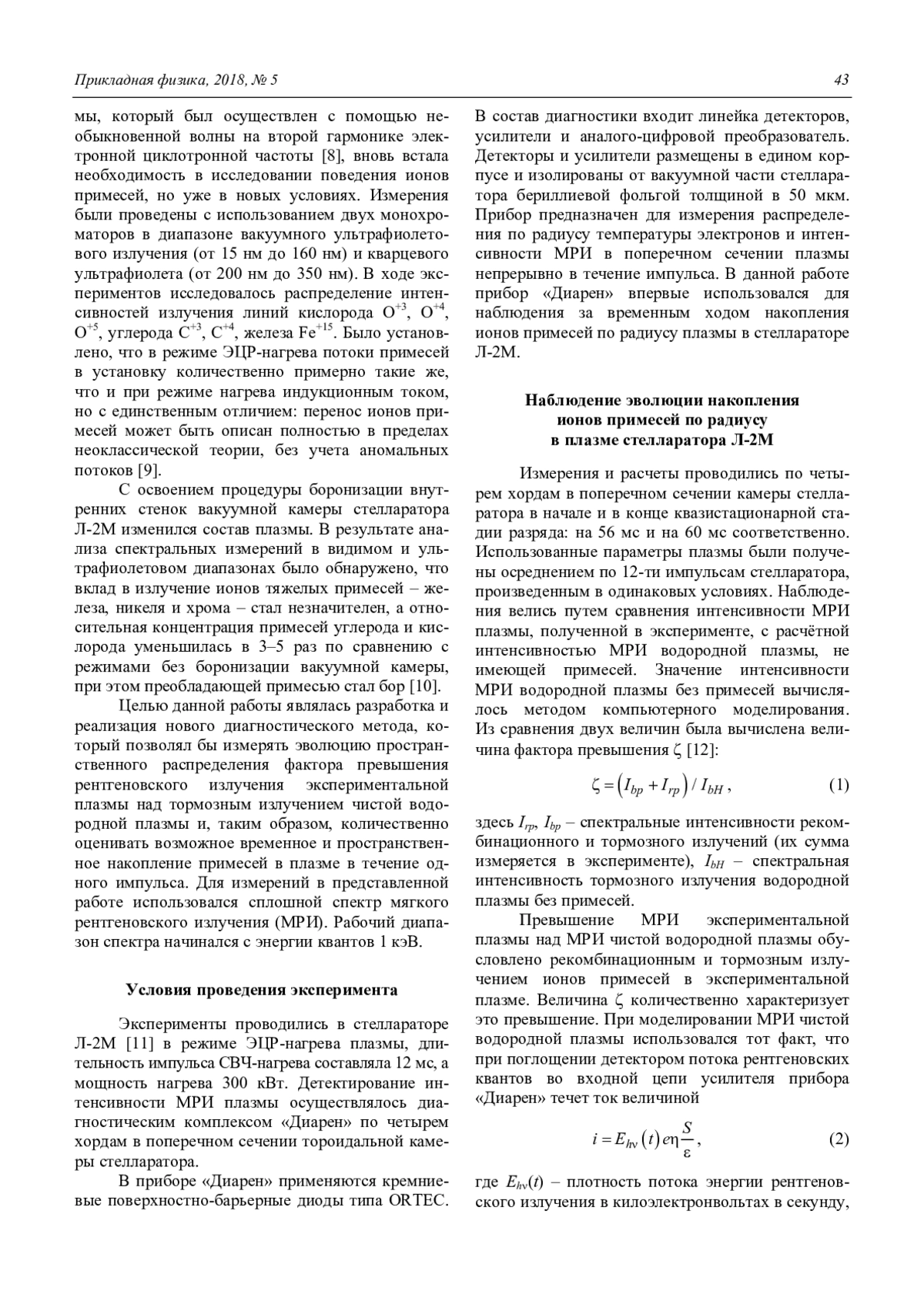 МЕЩЕРЯКОВ А. И., ВАФИН И. Ю. РАДИАЛЬНОЕ РАСПРЕДЕЛЕНИЕ И ДИНАМИКА НАКОПЛЕНИЯ ИОНОВ ПРИМЕСЕЙ В ПЛАЗМЕ СТЕЛЛАРАТОРА Л-2М // ПРИКЛАДНАЯ ФИЗИКА. 2018. №5