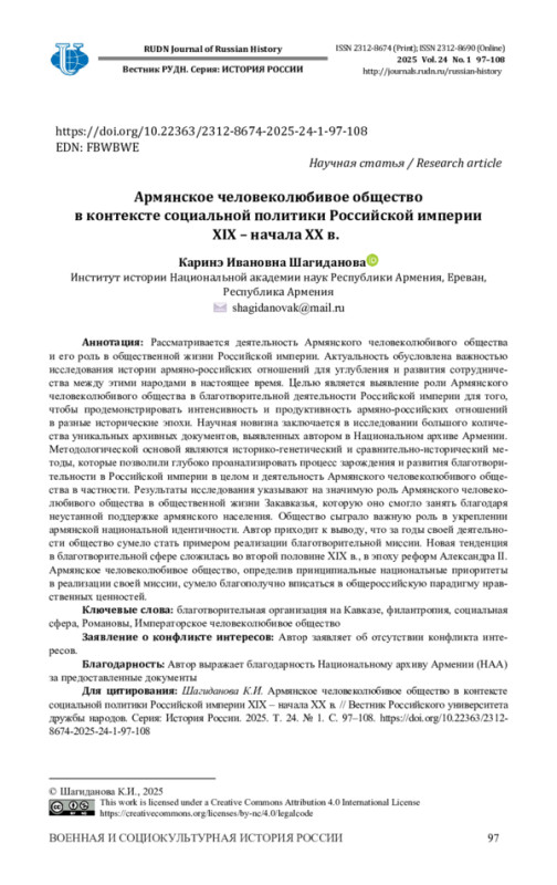 Результаты исследования указывают на значимую роль Армянского человеколюбивого общества в общественной жизни Закавказья, которую оно смогло занять благодаря неустанной поддержке армянского населения. Общество сыграло важную роль в укреплении армянской национальной идентичности. Автор приходит к выводу, что за годы своей деятельности общество сумело стать примером реализации благотворительной миссии. Новая тенденция в благотворительной сфере сложилась во второй половине XIX в., в эпоху реформ Александра II. Армянское человеколюбивое общество, определив принципиальные национальные приоритеты в реализации своей миссии, сумело благополучно вписаться в общероссийскую парадигму нравственных ценностей.