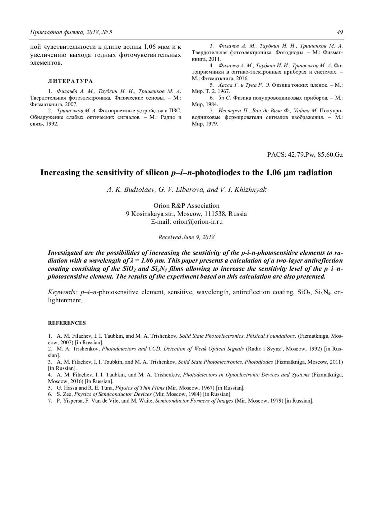 БУДТОЛАЕВ А. К., ЛИБЕРОВА Г. В., ХИЖНЯК В. И. ПОВЫШЕНИЕ ЧУВСТВИТЕЛЬНОСТИ КРЕМНИЕВЫХ P–I–N-ФОТОДИОДОВ К ИЗЛУЧЕНИЮ С ДЛИНОЙ ВОЛНЫ 1,06 МКМ // ПРИКЛАДНАЯ ФИЗИКА. 2018. №5