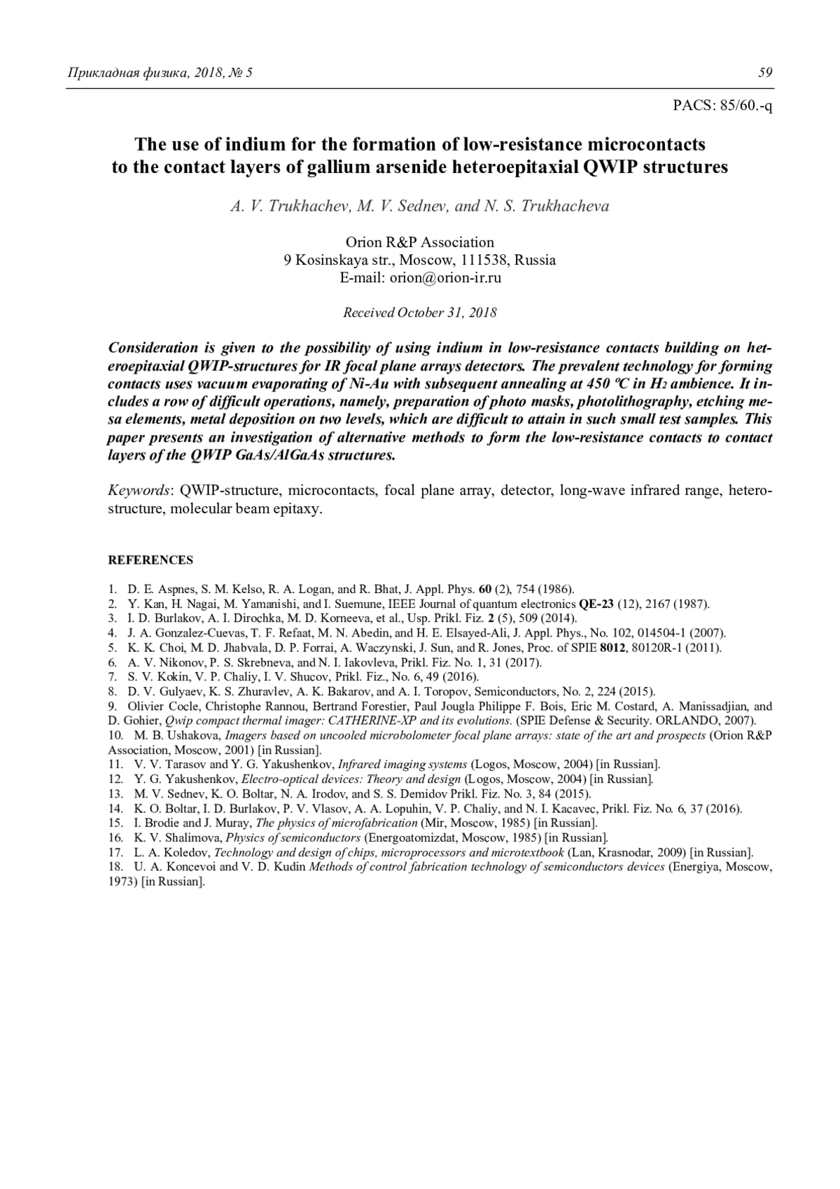 A. V. Trukhachev, M. V. Sednev, and N. S. Trukhacheva The use of indium for the formation of low-resistance microcontacts to the contact layers of gallium arsenide heteroepitaxial QWIP structures 55