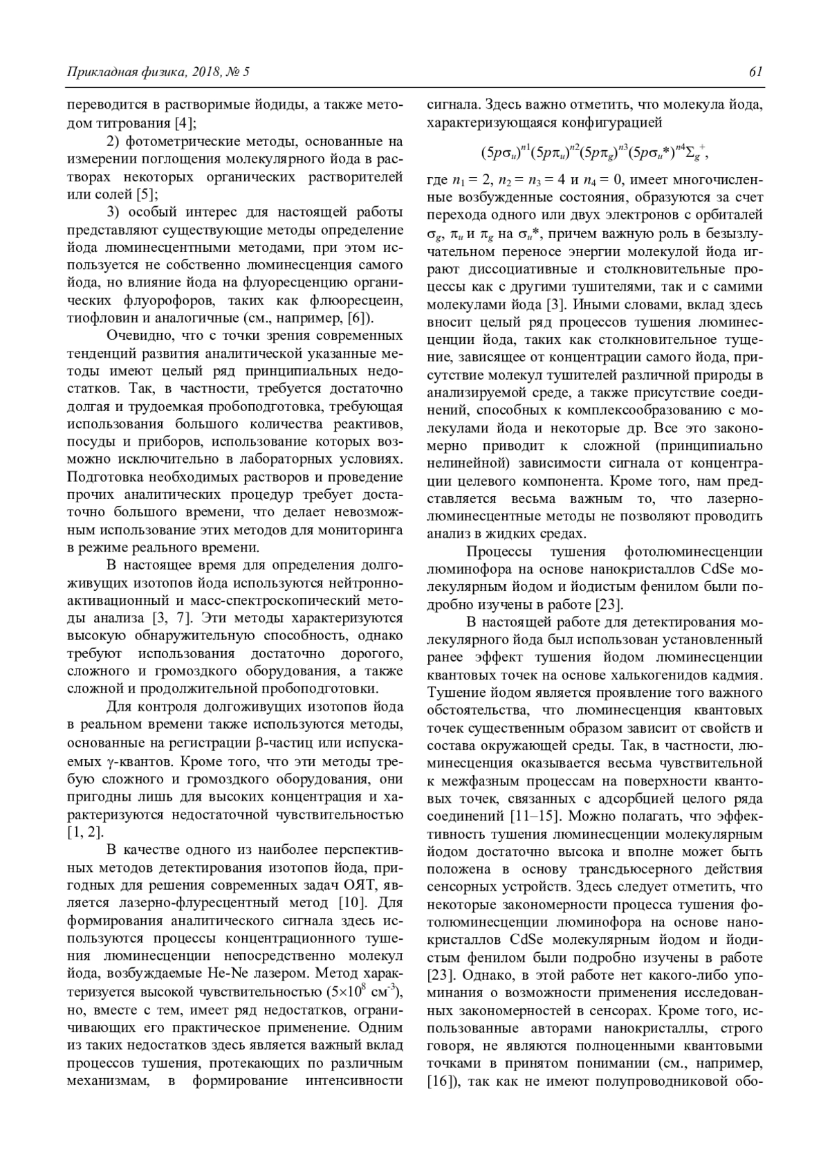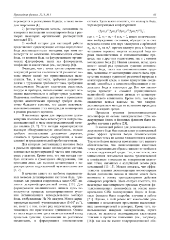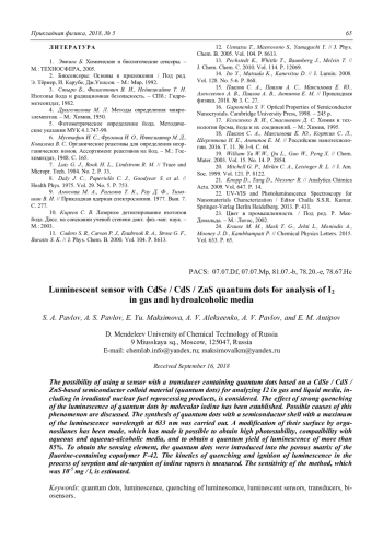 S. A. Pavlov, A. S. Pavlov, E. Yu. Maksimova, A. V. Alekseenko, A. V. Pavlov, and E. M. Antipov Luminescent sensor with CdSe / CdS / ZnS quantum dots for analysis of I2 in gas and hydroalco-holic media 60