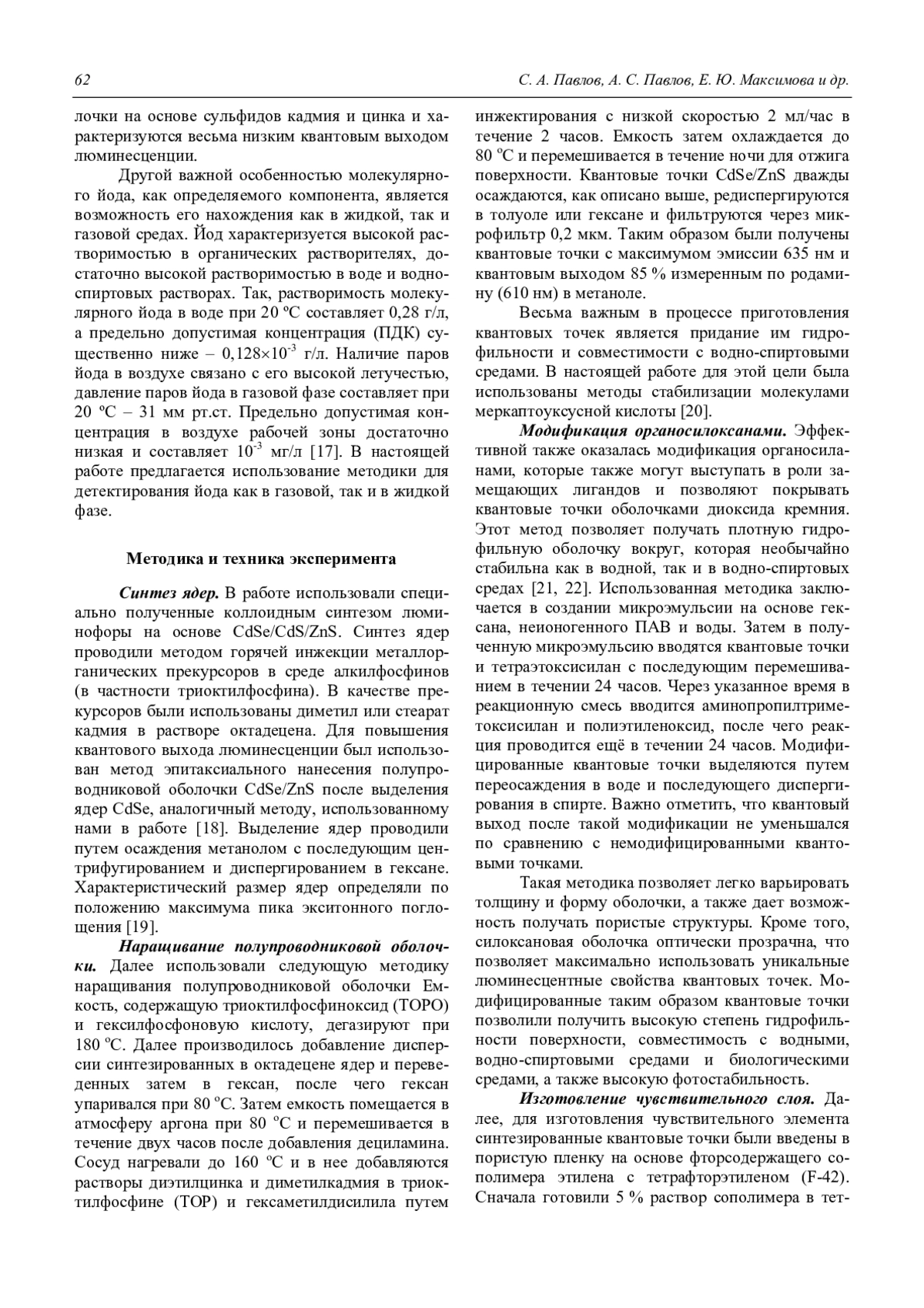 Павлов С. А., Павлов А. С., Максимова Е. Ю., Алексеенко А. В., Павлов А. В., Антипов Е. М. Люминесцентный сенсор на квантовых точках CdSe/CdS/ZnS для анализа I2 в газовых и водно-спиртовых средах 60