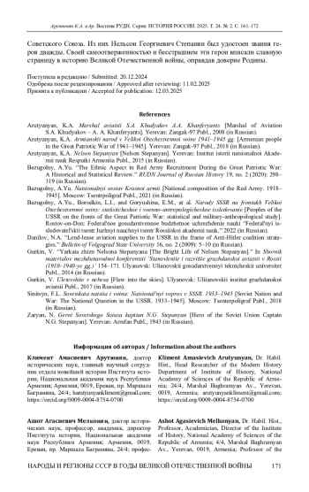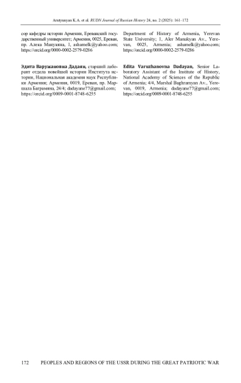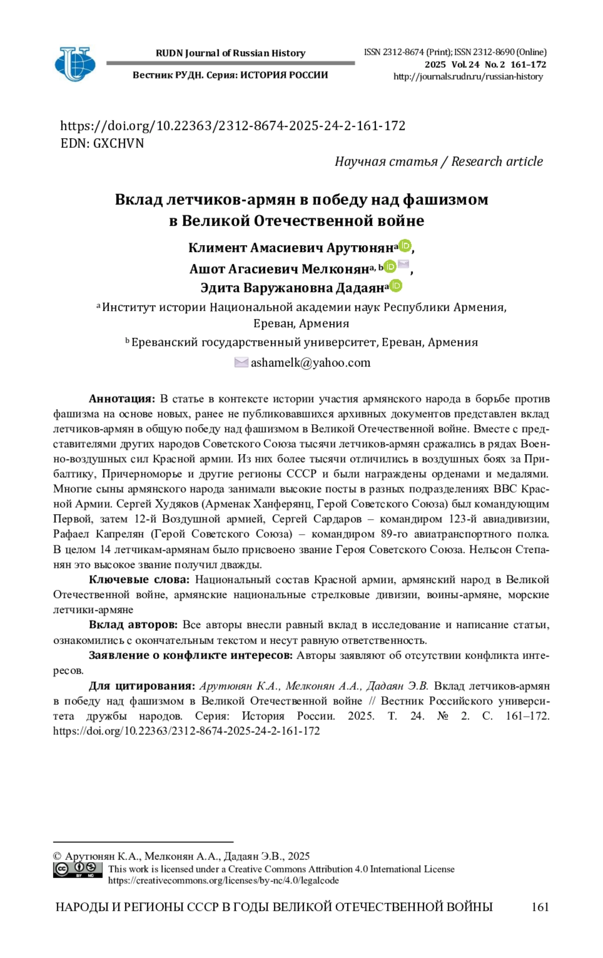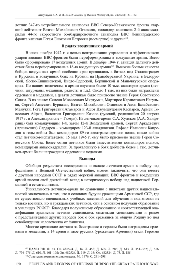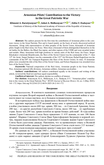 АРУТЮНЯН К. А., МЕЛКОНЯН А. А., ДАДАЯН Э. В. ВКЛАД ЛЕТЧИКОВ-АРМЯН В ПОБЕДУ НАД ФАШИЗМОМ В ВЕЛИКОЙ ОТЕЧЕСТВЕННОЙ ВОЙНЕ // ВЕСТНИК РОССИЙСКОГО УНИВЕРСИТЕТА ДРУЖБЫ НАРОДОВ. СЕРИЯ: ИСТОРИЯ РОССИИ. 2025. ТОМ 24 № 2