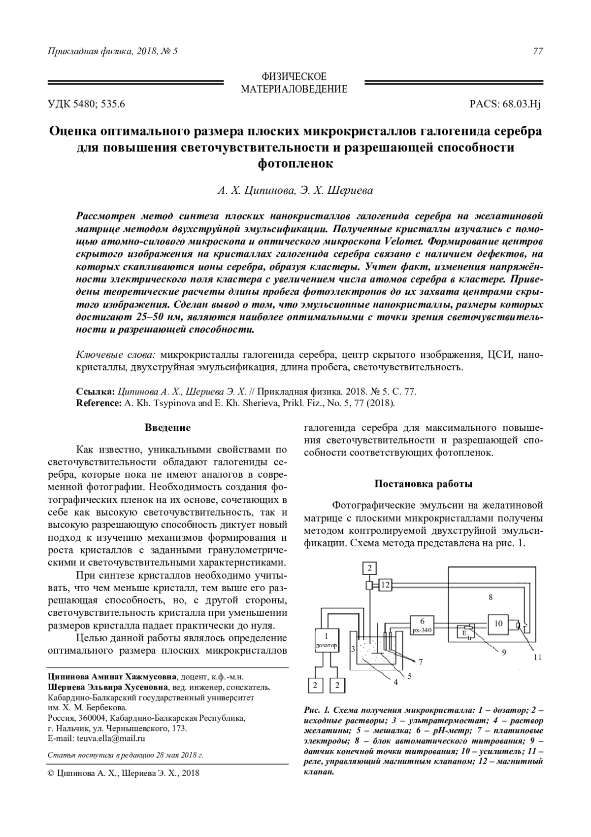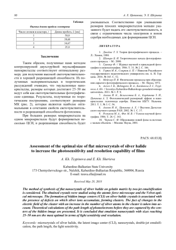 ЦИПИНОВА А. Х., ШЕРИЕВА Э. Х. ОЦЕНКА ОПТИМАЛЬНОГО РАЗМЕРА ПЛОСКИХ МИКРОКРИСТАЛЛОВ ГАЛОГЕНИДА СЕРЕБРА ДЛЯ ПОВЫШЕНИЯ СВЕТОЧУВСТВИТЕЛЬНОСТИ И РАЗРЕШАЮЩЕЙ СПОСОБНОСТИ ФОТОПЛЕНОК // ПРИКЛАДНАЯ ФИЗИКА. 2018. №5
