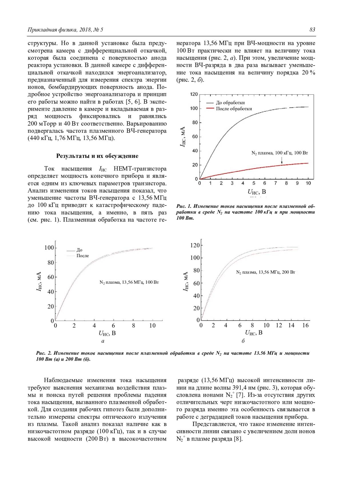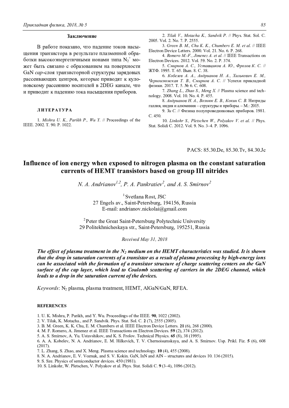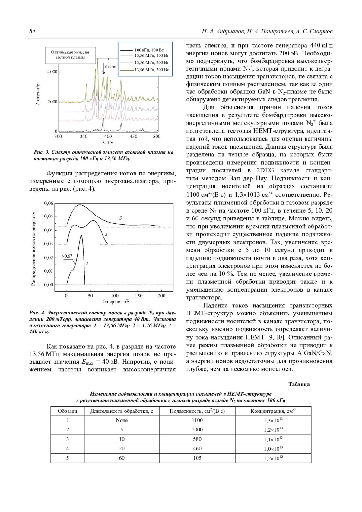 N. A. Andrianov, P. A. Pankratiev, and A. S. Smirnov Influence of ion energy when exposed to nitrogen plasma on the constant saturation currents of HEMT transistors based on group III nitrides 82