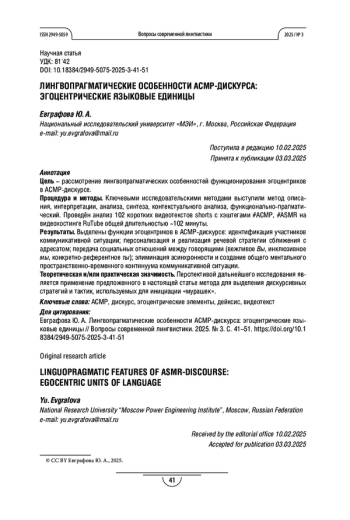 Цель - рассмотрение лингвопрагматических особенностей функционирования эгоцентриков в АСМР-дискурсе.
