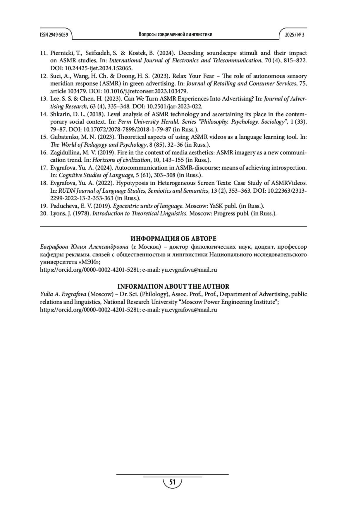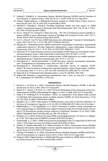 4. Евграфова Ю.А. Основные особенности АСМР-дискурса (на материале сюжетных видеотекстов) // Вопросы современной лингвистики. 2024. № 4. С.28-39. DOI: 10.18384/2949-5075-2024-4-28-39