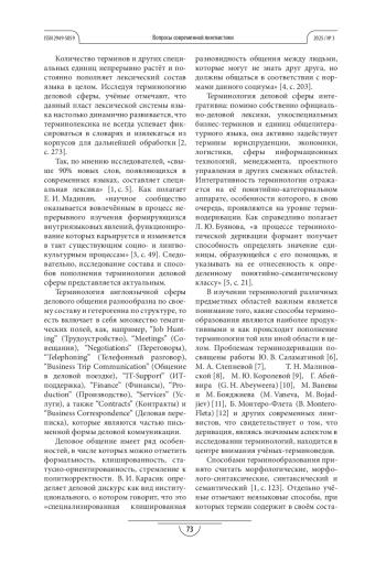 Результаты. Терминология деловой сферы рассмотрена как сложный гетерогенный конструкт, составляющими которого являются единицы общеотраслевого, узкоспециального, общелитературного и междисциплинарного характера. Проанализированы структурные и деривационные модели, актуальные в настоящее время для исследуемой терминологии. Выявлены основные форманты, участвующие в аффиксальной терминодеривации, и произведена систематизация морфологических средств в соответствии с понятийными блоками сферы делового общения. Установлено количество терминоединиц, образованных синтаксическим способом, а также методом аффиксации, аббревиации, словосложения, конверсии и другими методами в процентном соотношении, что позволило определить наиболее продуктивные в исследуемой сфере.