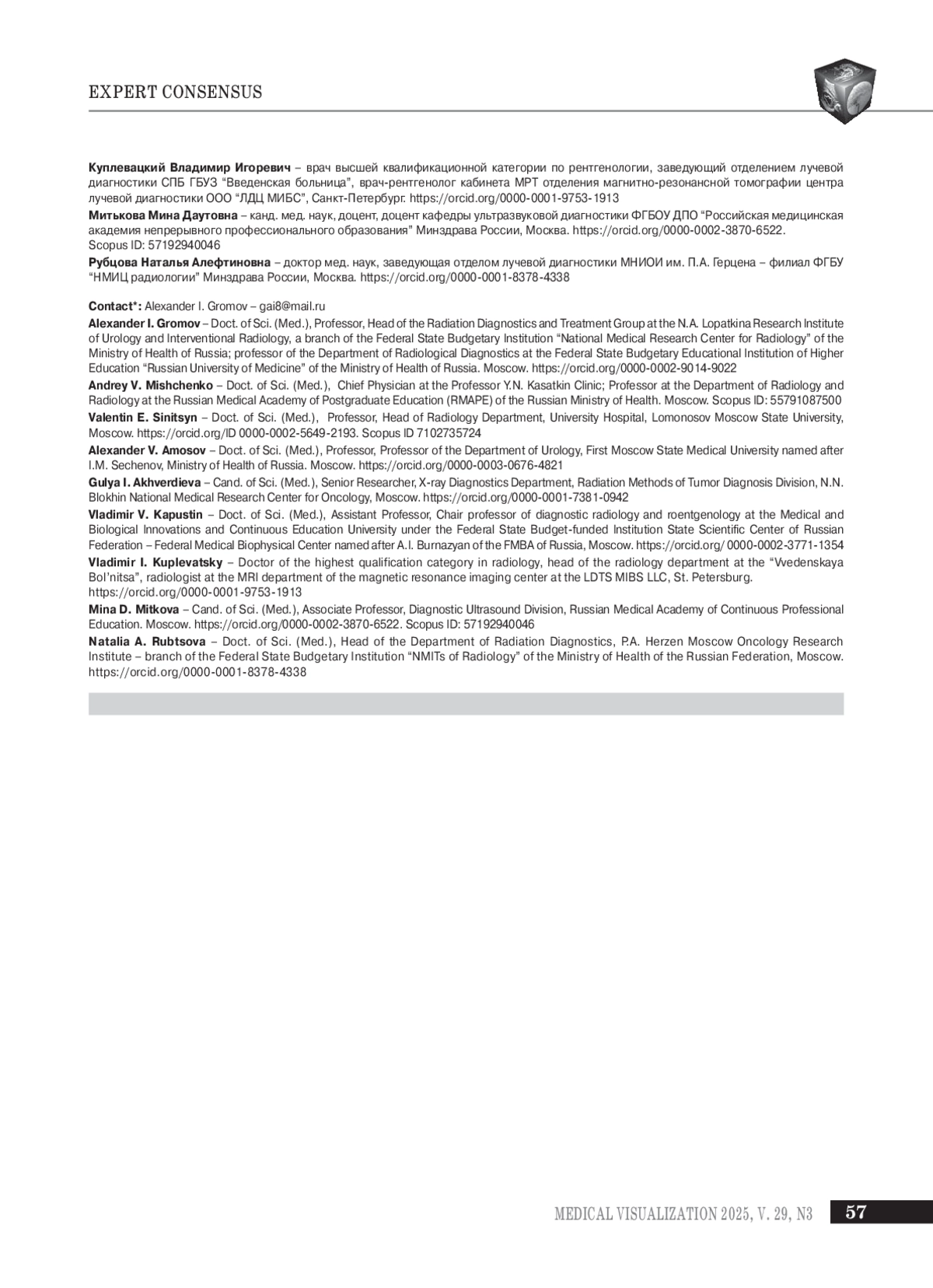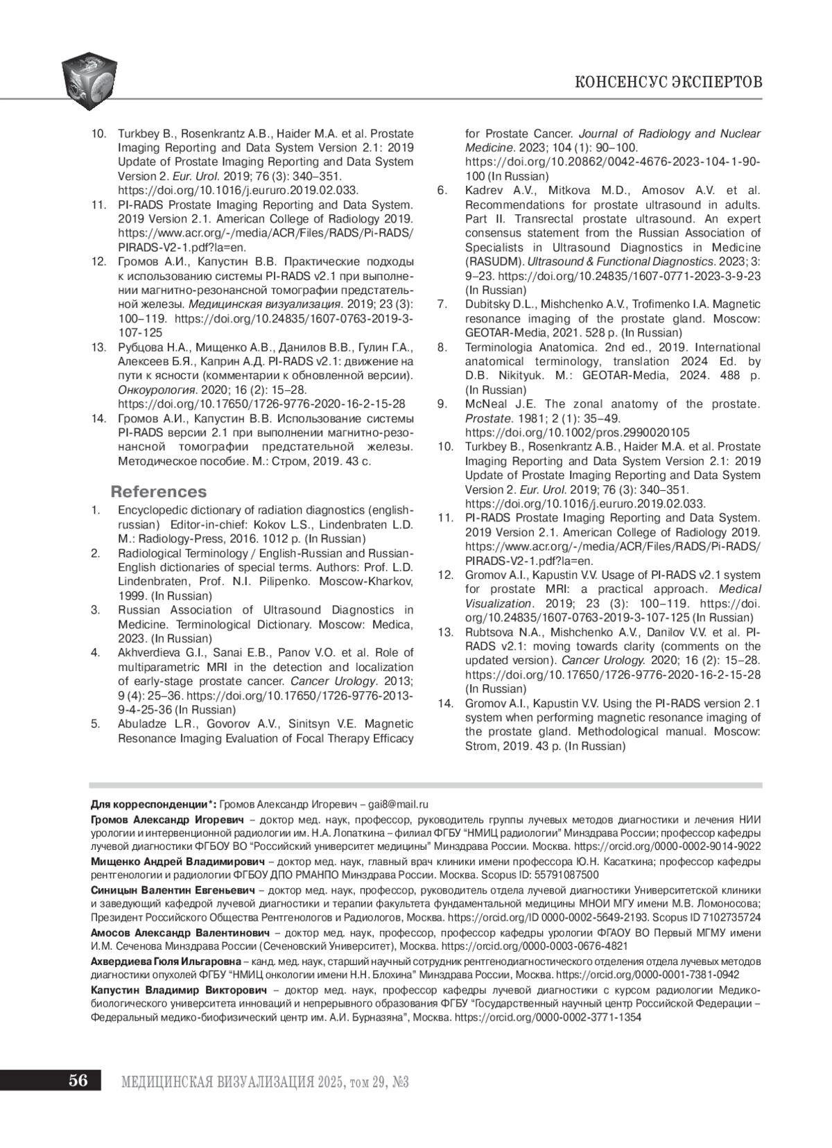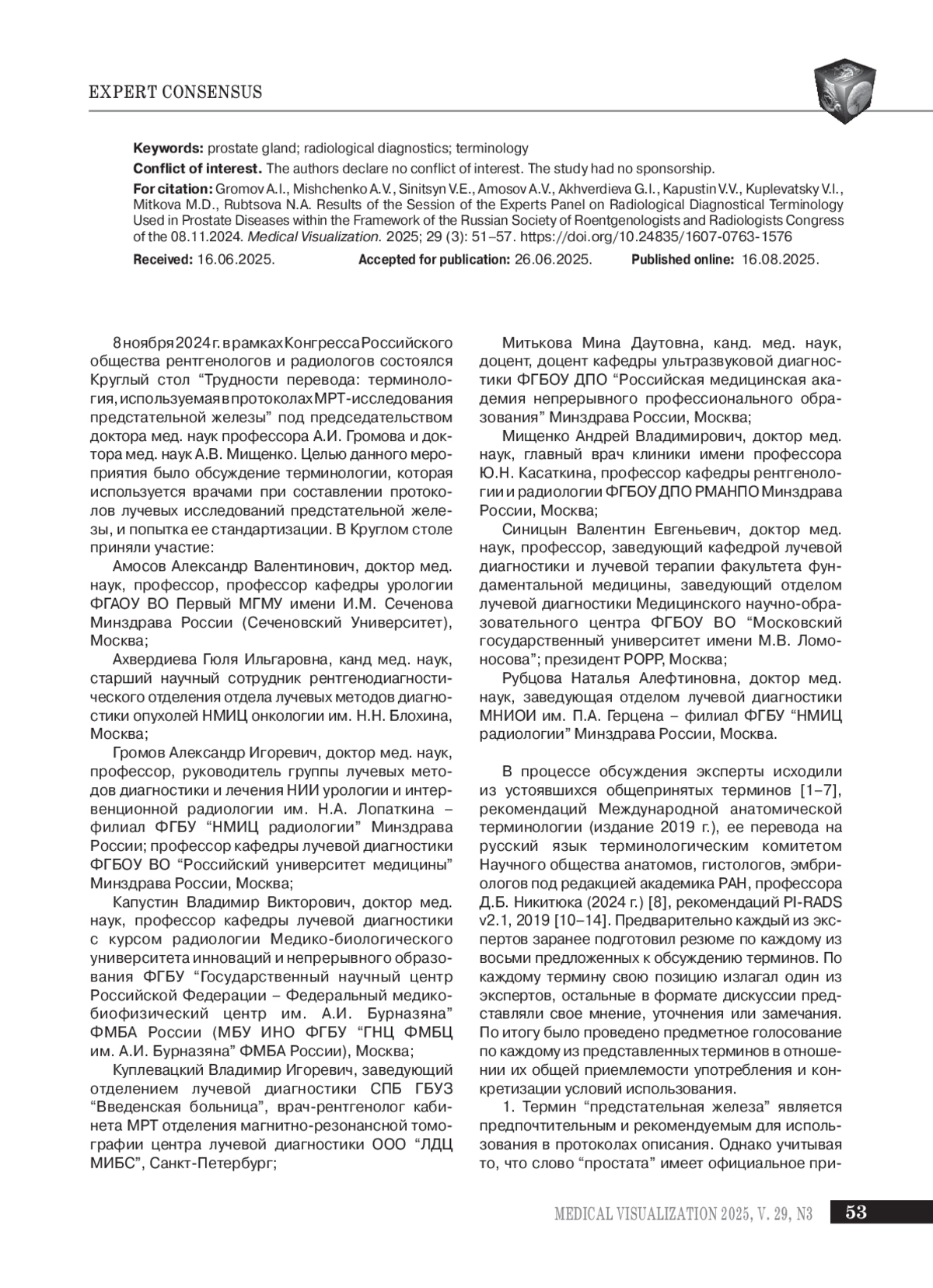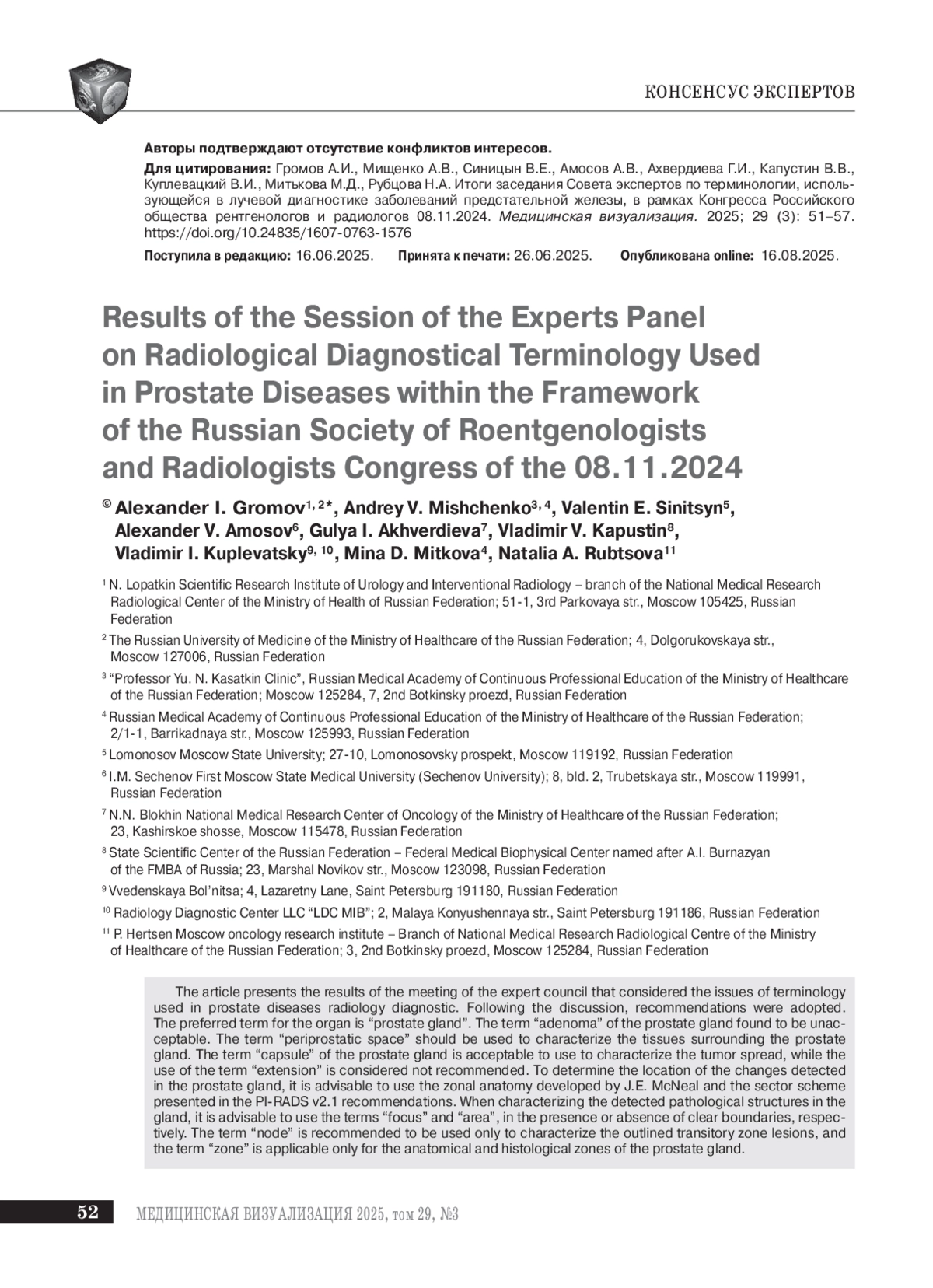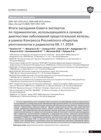 ГРОМОВ А. И., МИЩЕНКО А. В., СИНИЦЫН В. Е., АМОСОВ А. В., АХВЕРДИЕВА Г. И., КАПУСТИН В. В., КУПЛЕВАЦКИЙ В. И., МИТЬКОВА М. Д., РУБЦОВА Н. А. ИТОГИ ЗАСЕДАНИЯ СОВЕТА ЭКСПЕРТОВ ПО ТЕРМИНОЛОГИИ, ИСПОЛЬЗУЮЩЕЙСЯ В ЛУЧЕВОЙ ДИАГНОСТИКЕ ЗАБОЛЕВАНИЙ ПРЕДСТАТЕЛЬНОЙ ЖЕЛЕЗЫ, В РАМКАХ КОНГРЕССА РОССИЙСКОГО ОБЩЕСТВА РЕНТГЕНОЛОГОВ И РАДИОЛОГОВ 08.11.2024 // МЕДИЦИНСКАЯ ВИЗУАЛИЗАЦИЯ. 2025. № 3, ТОМ 29
