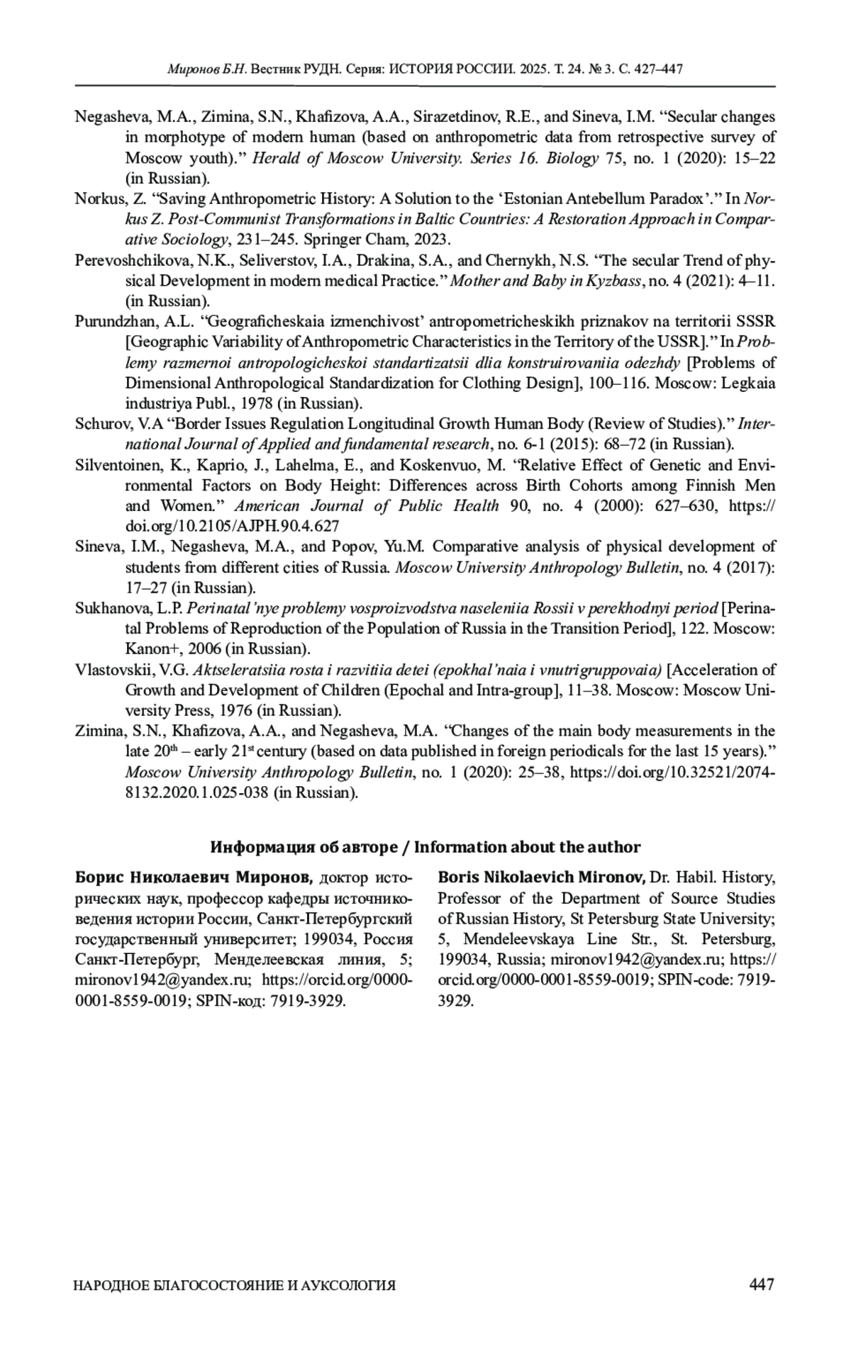 19. Миронов Б.Н. Рост и вес россиян сталинской эпохи // Демоскоп. 2003. № 129. URL: https://www.demoscope.ru/week-ly/2003/0129/tema01.php.