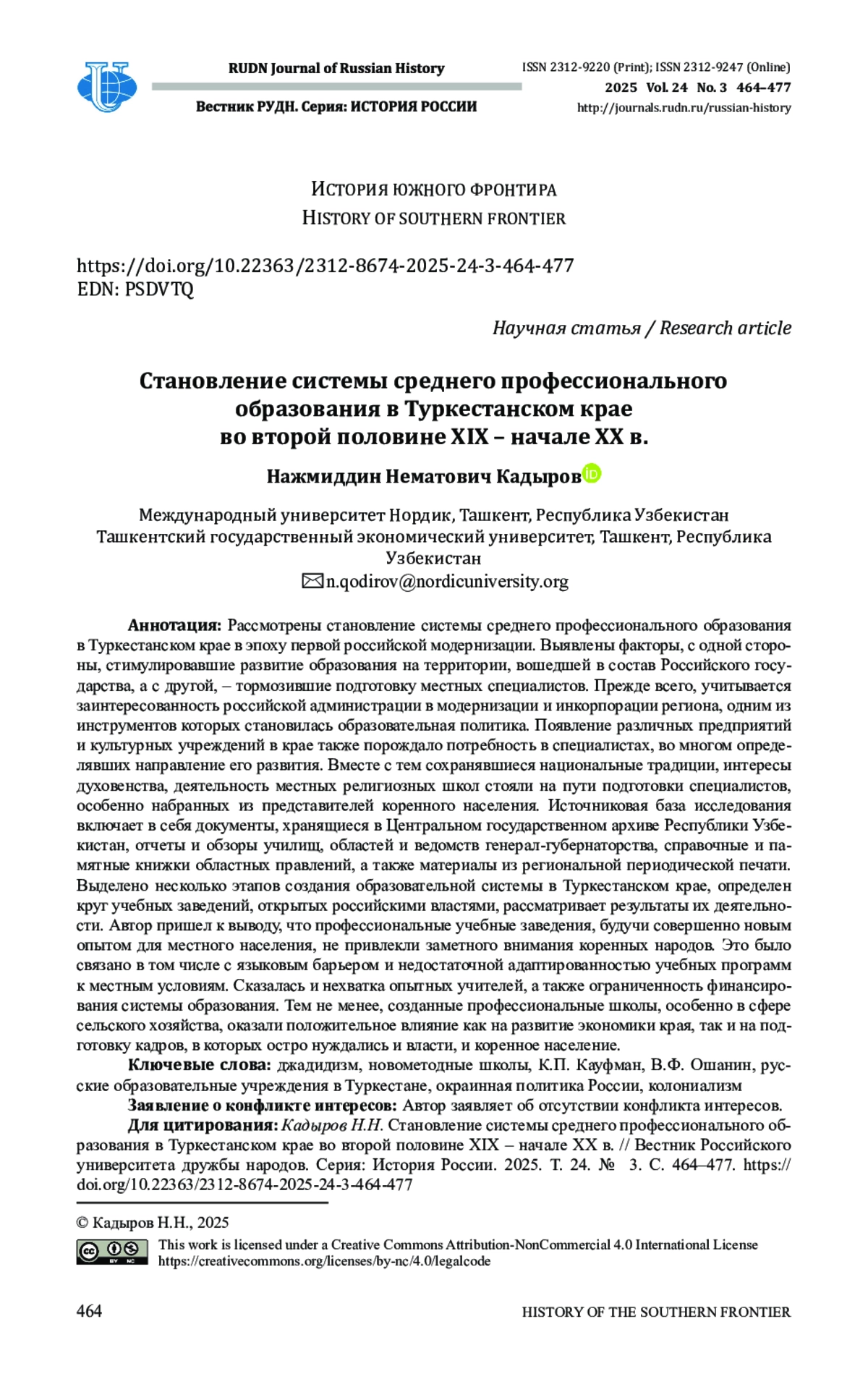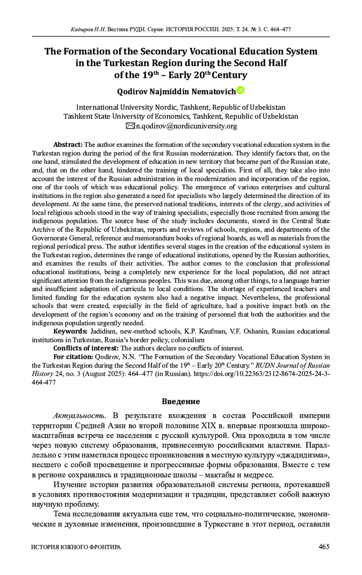 Рассмотрены становление системы среднего профессионального образования в Туркестанском крае в эпоху первой российской модернизации. Выявлены факторы, с одной стороны, стимулировавшие развитие образования на территории, вошедшей в состав Российского государства, а с другой, - тормозившие подготовку местных специалистов. Прежде всего, учитывается заинтересованность российской администрации в модернизации и инкорпорации региона, одним из инструментов которых становилась образовательная политика. Появление различных предприятий и культурных учреждений в крае также порождало потребность в специалистах, во многом определявших направление его развития. Вместе с тем сохранявшиеся национальные традиции, интересы духовенства, деятельность местных религиозных школ стояли на пути подготовки специалистов, особенно набранных из представителей коренного населения. Источниковая база исследования включает в себя документы, хранящиеся в Центральном государственном архиве Республики Узбекистан, отчеты и обзоры училищ, областей и ведомств генерал-губернаторства, справочные и памятные книжки областных правлений, а также материалы из региональной периодической печати. Выделено несколько этапов создания образовательной системы в Туркестанском крае, определен круг учебных заведений, открытых российскими властями, рассматривает результаты их деятельности. Автор пришел к выводу, что профессиональные учебные заведения, будучи совершенно новым опытом для местного населения, не привлекли заметного внимания коренных на родов. Это было связано в том числе с языковым барьером и недостаточной адаптированностью учебных программ к местным условиям. Сказалась и нехватка опытных учителей, а также ограниченность финансирования системы образования. Тем не менее, созданные профессиональные школы, особенно в сфере сельского хозяйства, оказали положительное влияние как на развитие экономики края, так и на подготовку кадров, в которых остро нуждались и власти, и коренное население.