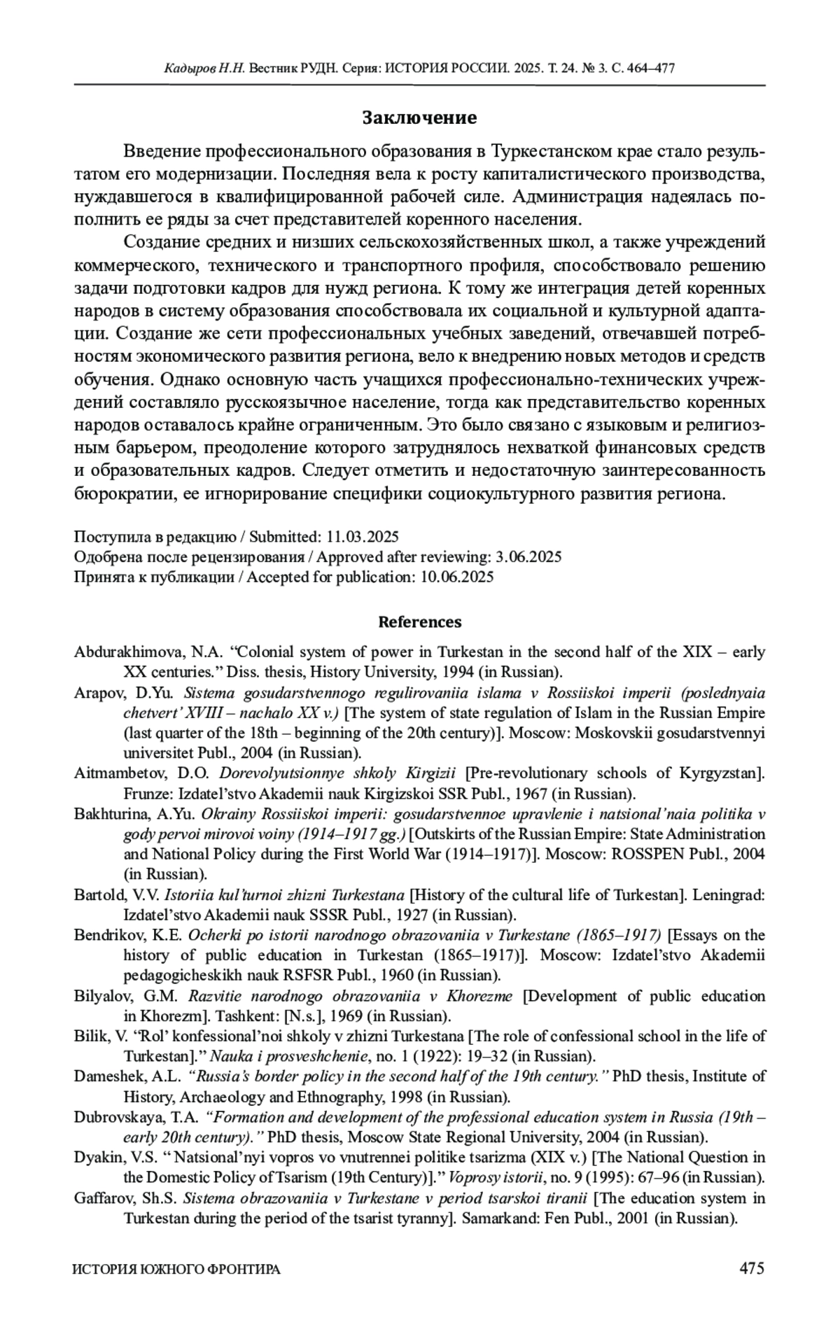 36. Садыков Х.Д. Колониальная политика царизма в Туркестане и борьба за национальную независимость в начале XX в. Автореф. дис. … докт. ист. наук. Ташкент: Академия наук Республики Узбекистан, Институт истории, 1994. 84 с.
