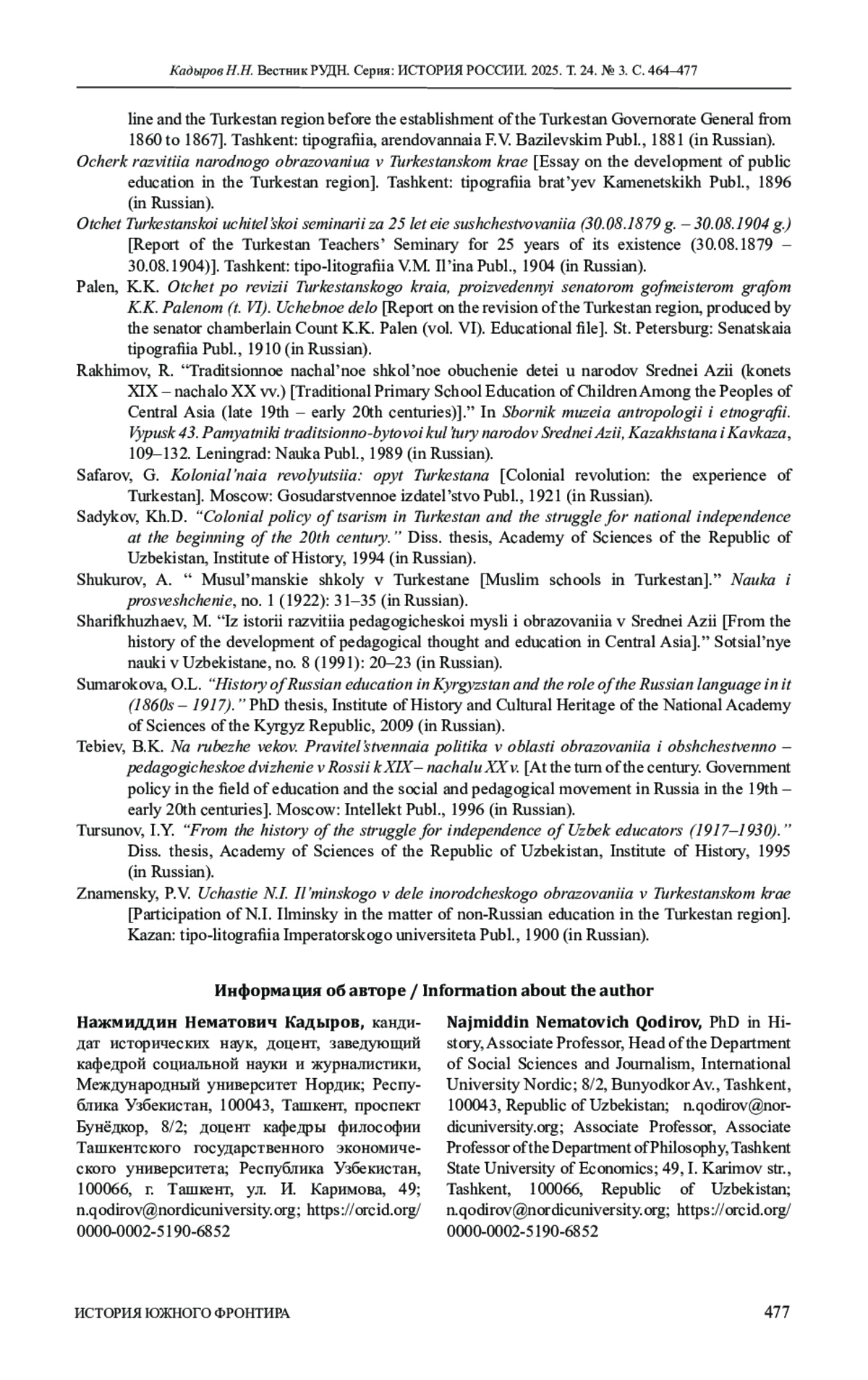 20. Кадыров Н.Н. История русских образовательных учреждений в Туркестане (1867-1917 гг.). Ташкент: [Б.и.], 2014. 310 с.
