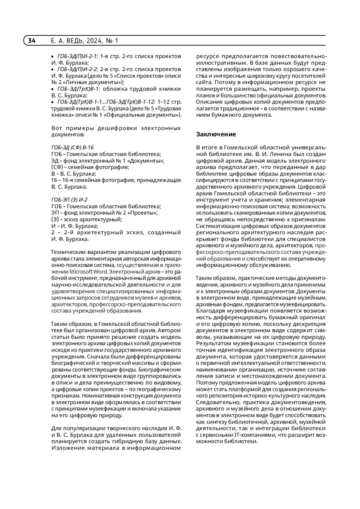 В 2019 году крупнейшая региональная книжница Гомельщины стала обладателем уникального архива И. Ф. и В. С. Бурлака. Подаренные материалы сканировались. Исключительно в электронной форме было передано свыше 50 % экспонатов. Поэтому возникла необходимость в создании Цифрового архива, при организации которого автором данной статьи было принято решение опираться на практику государственного архивного учреждения.