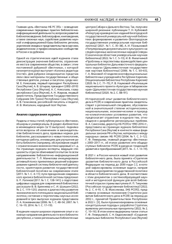 По данным Научной электронной библиотеки (НЭБ) eLIBRARY. RU, в рубрике ГРНТИ «13.31.00 Библиотечное дело. Библиотековедение» представлено 80 журналов, из них только 6 журналов выпускаются региональными библиотеками, включая НБ РС(Я), центральные библиотеки Кузбасса, Карелии, Татарстана, Бурятии, Хабаровского края.