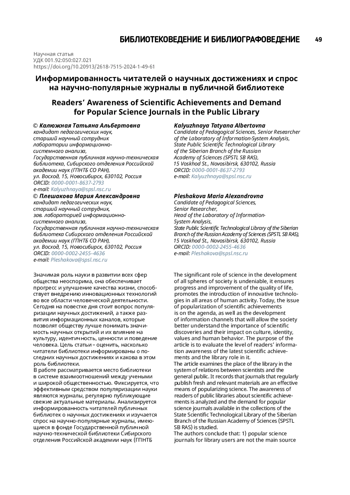 КАЛЮЖНАЯ Т. А., ПЛЕШАКОВА М. А. ИНФОРМИРОВАННОСТЬ ЧИТАТЕЛЕЙ О НАУЧНЫХ ДОСТИЖЕНИЯХ И СПРОС НА НАУЧНО-ПОПУЛЯРНЫЕ ЖУРНАЛЫ В ПУБЛИЧНОЙ БИБЛИОТЕКЕ // ТРУДЫ ГПНТБ СО РАН. 2024. № 1