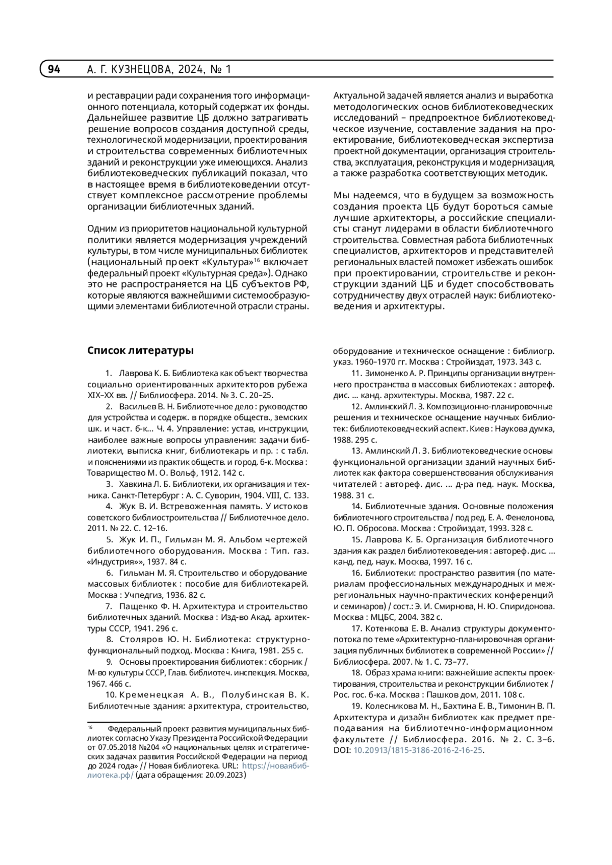 19. Колесникова М. Н., Бахтина Е. В., Тимонин В. П. Архитектура и дизайн библиотек как предмет преподавания на библиотечно-информационном факультете // Библиосфера. 2016. № 2. С. 3-6. https://doi.org/10.20913/1815-3186-2016-2-16-25.