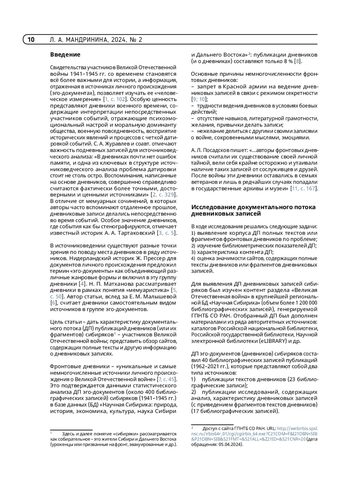 Цель статьи – охарактеризовать документальный поток (ДП) публикаций дневниковых записей сибиряков – участников Великой Отечественной войны 1941–1945 гг. Показано место дневников в источниковедении и значение дневниковых записей для изучения антропологического содержания и психологии войны. Обоснованы причины немногочисленности фронтовых дневников по сравнению с другими видами эго-документов (воспоминаниями, письмами). Впервые был выявлен и комплексно изучен ДП из 40 публикаций дневников (и о дневниках) сибиряков: представлены библиометрические показатели и характеристика контента; выявлены сайты, содержащие полные тексты дневников (или их фрагментов) и дана оценка их значимости; определены места их хранения. В исследуемом ДП представлена информация о дневниках 28 сибиряков – рядовых участников войны, которые в мирное время в большинстве своем были обладателями гражданских профессий. Дана оценка сайта «Прожито», реализующего проект по сбору полных текстов; обоснована необходимость работы по сохранению полных текстов дневников: выявлению дневников, хранящихся в личных или семейных архивах и передачи их (или их копий) в государственные музеи и архивы; подчеркнуто значение исследований эго-документов о Великой Отечественной войне для образования и патриотического воспитания.