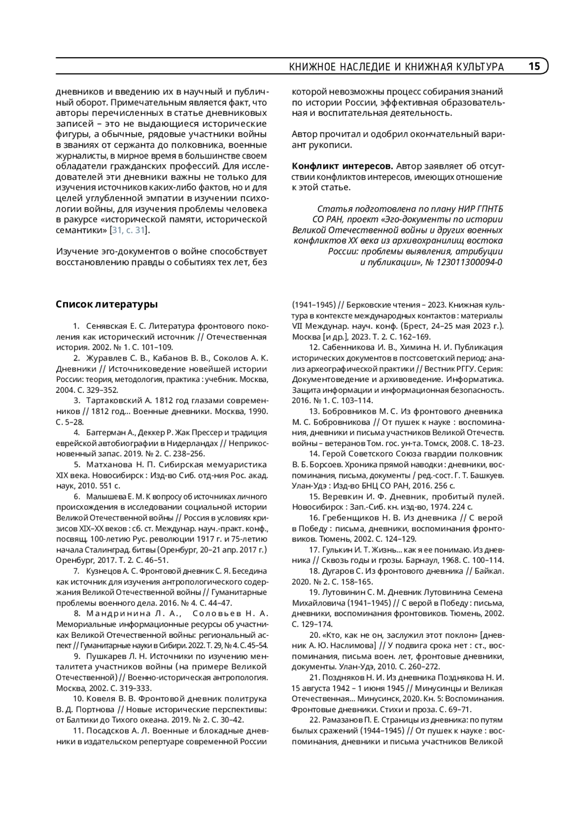 1. Сенявская Е. С. Литература фронтового поколения как исторический источник // Отечественная история. 2002. № 1. С. 101-109.