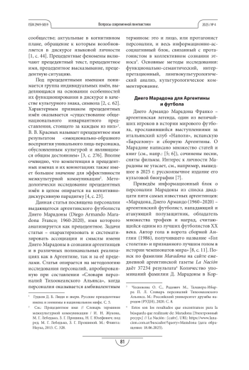 Статья: ДИЕГО МАРАДОНА КАК ПРЕЦЕДЕНТНОЕ ИМЯ В АРГЕНТИНСКОМ И ГЛОБАЛЬНОМ МЕДИЙНОМ ПРОСТРАНСТВЕ (2025)
