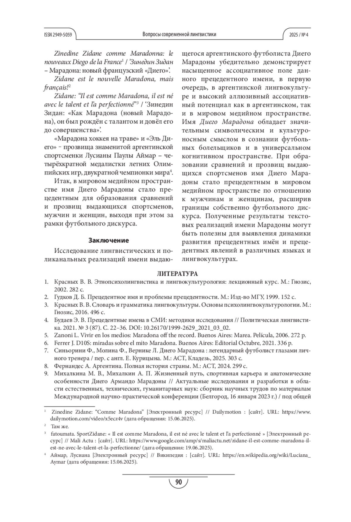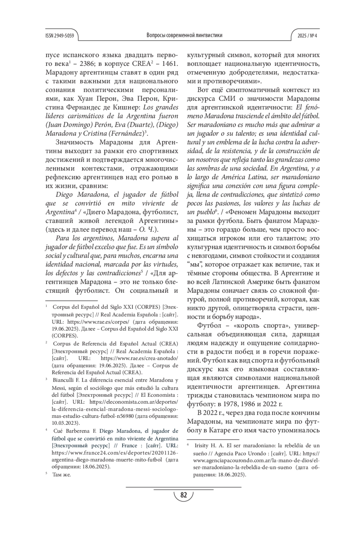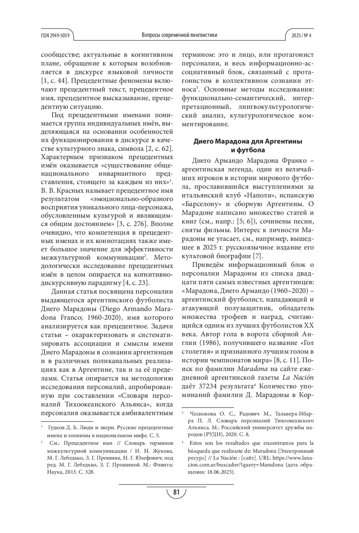ЧЕСНОКОВА О. С. ДИЕГО МАРАДОНА КАК ПРЕЦЕДЕНТНОЕ ИМЯ В АРГЕНТИНСКОМ И ГЛОБАЛЬНОМ МЕДИЙНОМ ПРОСТРАНСТВЕ // ВОПРОСЫ СОВРЕМЕННОЙ ЛИНГВИСТИКИ. 2025. № 4
