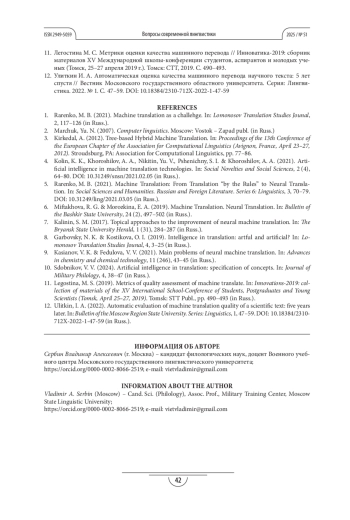 12. Улиткин И. А. Автоматическая оценка качества машинного перевода научного текста: 5 лет спустя // Вестник Московского государственного областного университета. Серия: Лингвистика. 2022. № 1. С. 47-59. DOI: 10.18384/2310-712X-2022-1-47-59 EDN: GTAUUM