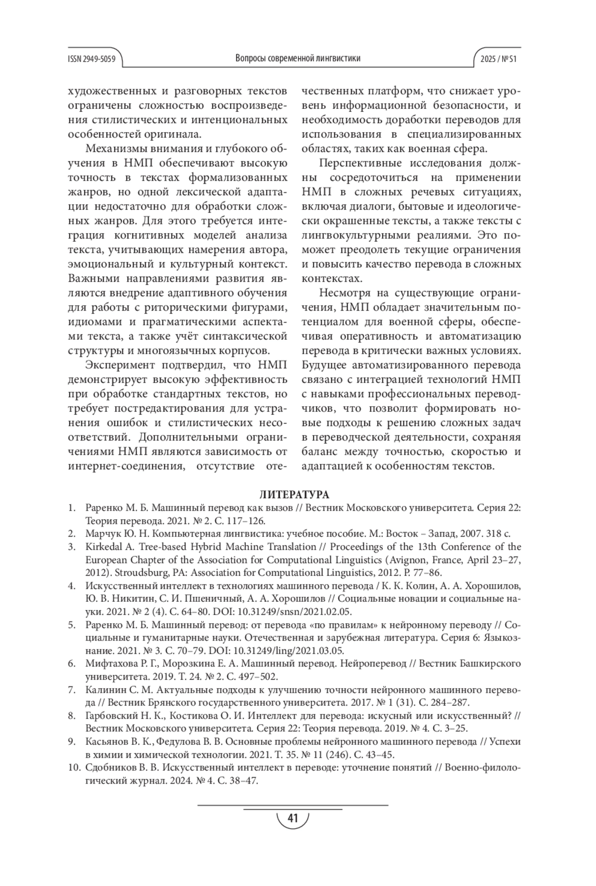 9. Касьянов В. К., Федулова В. В. Основные проблемы нейронного машинного перевода // Успехи в химии и химической технологии. 2021. Т. 35. № 11 (246). С. 43-45. EDN: ICBRAL