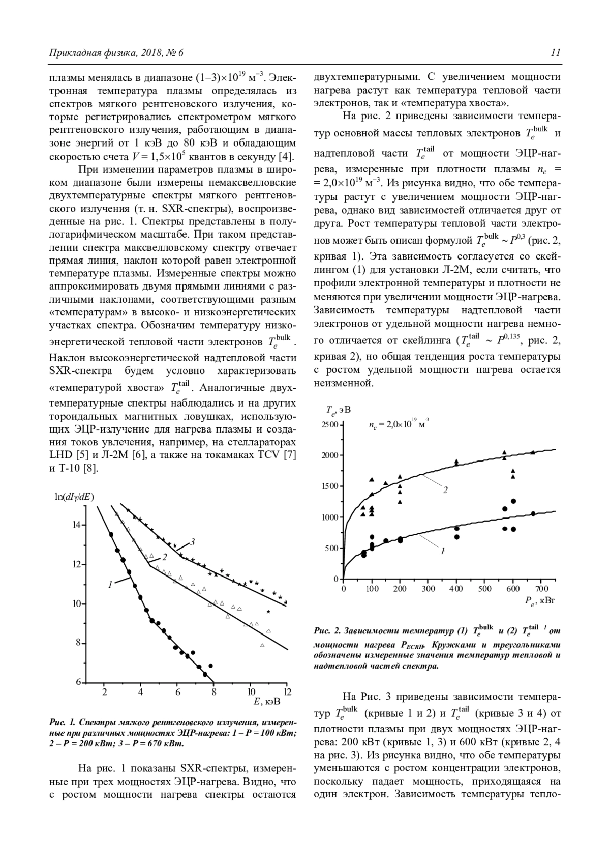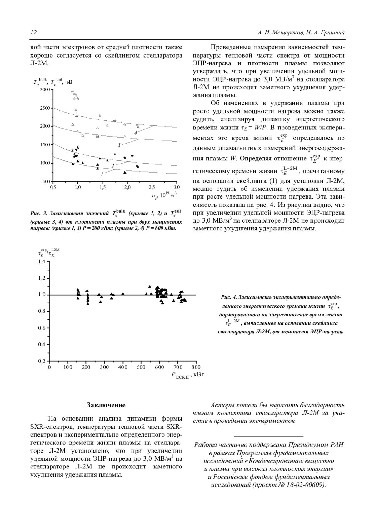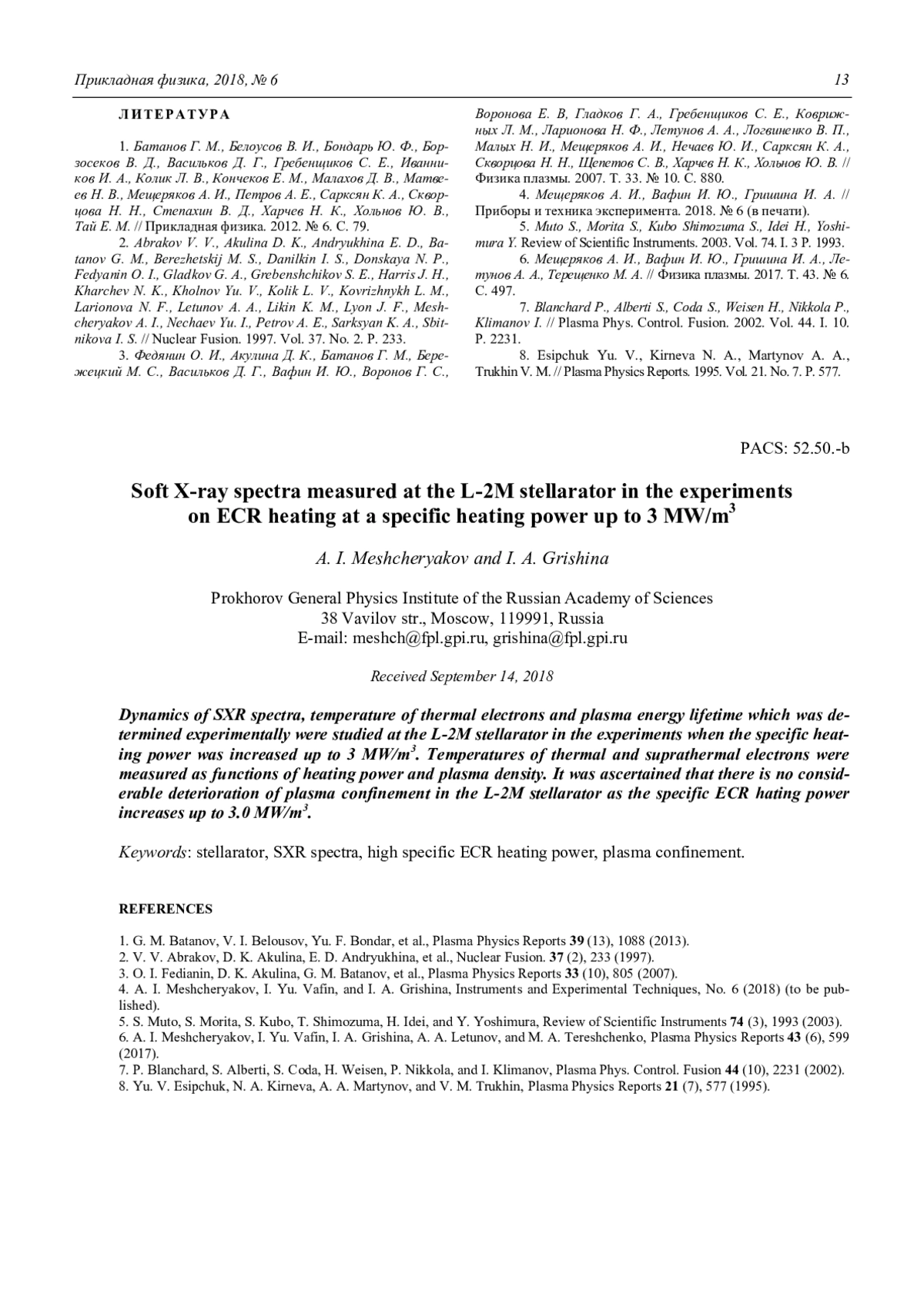 Мещеряков А. И., Гришина И. А. Спектры мягкого рентгеновского излучения в ре-жиме ЭЦР-нагрева плазмы с удельной мощностью нагрева до 3 МВт/м3 на стеллараторе Л-2М 10