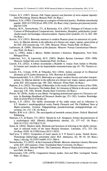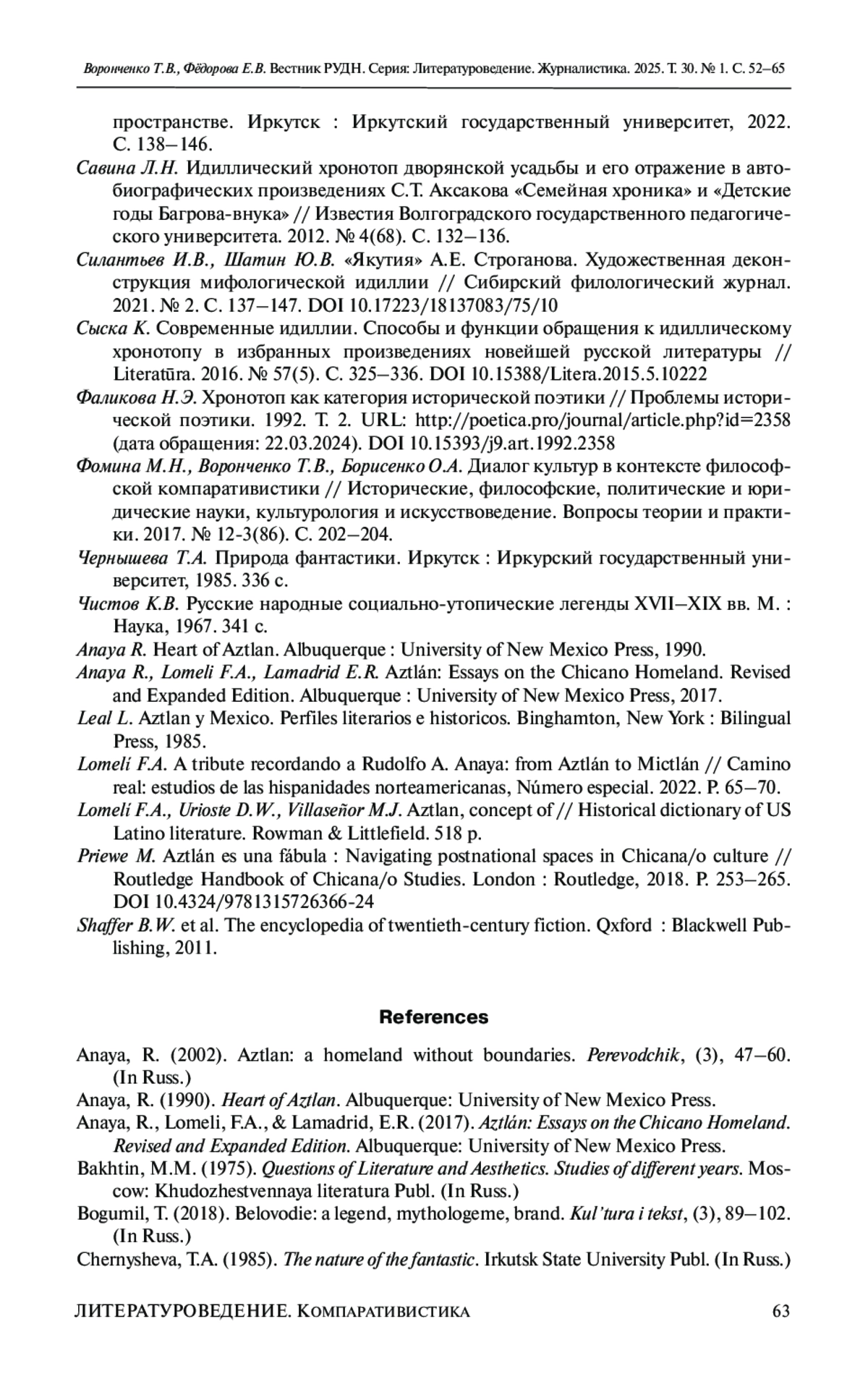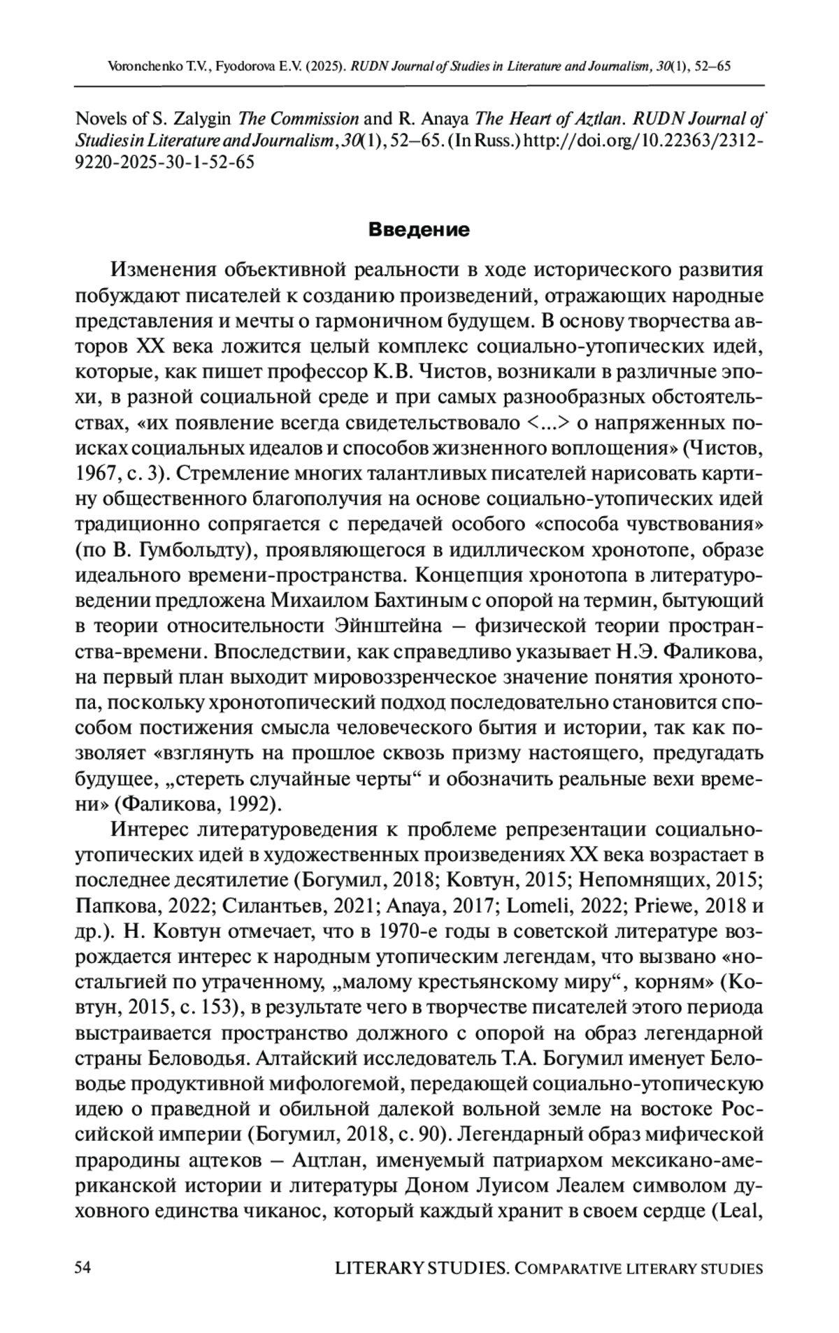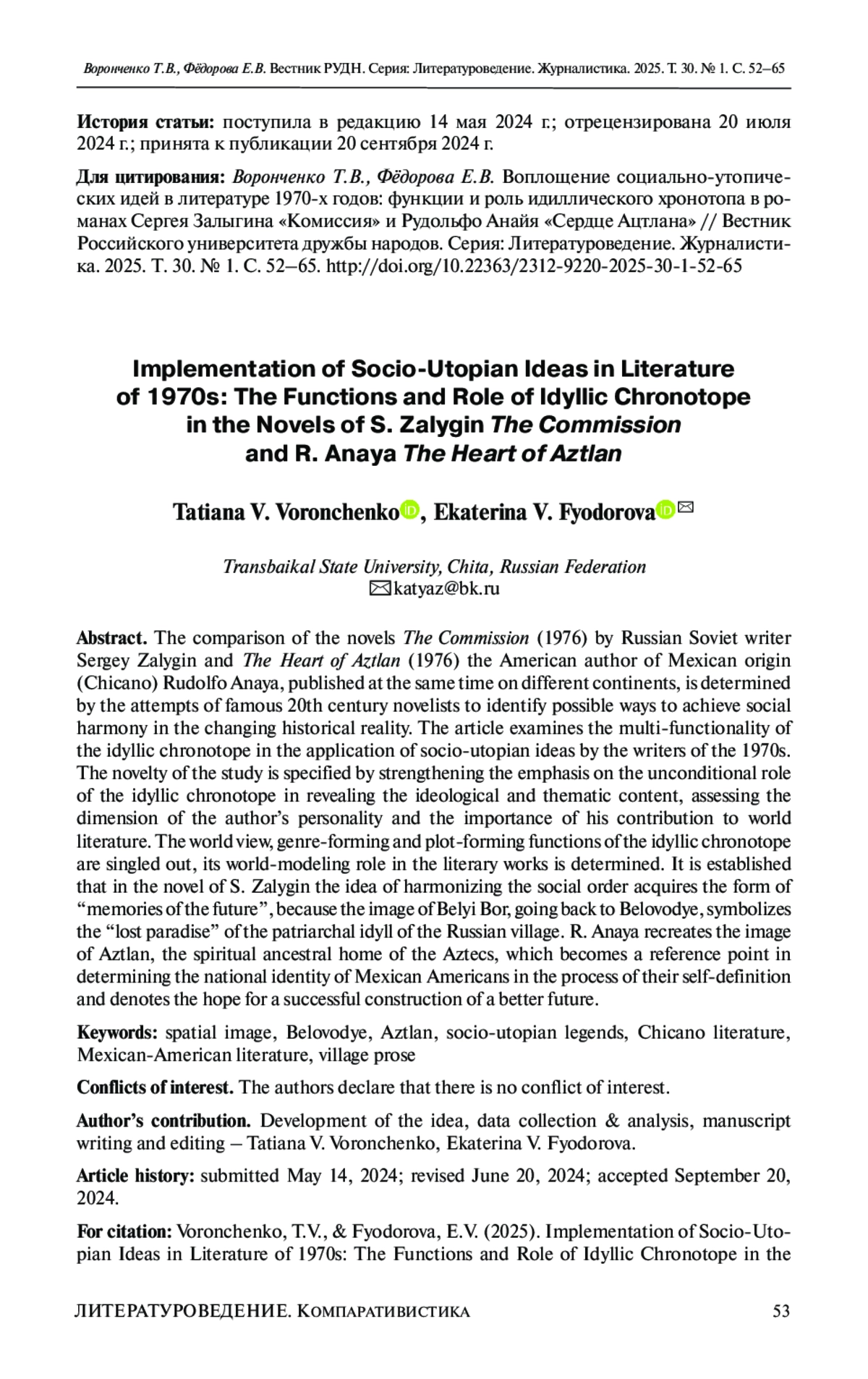 ВОРОНЧЕНКО Т. В., ФЕДОРОВА Е. В. ВОПЛОЩЕНИЕ СОЦИАЛЬНО-УТОПИЧЕСКИХ ИДЕЙ В ЛИТЕРАТУРЕ 1970-Х ГОДОВ: ФУНКЦИИ И РОЛЬ ИДИЛЛИЧЕСКОГО ХРОНОТОПА В РОМАНАХ СЕРГЕЯ ЗАЛЫГИНА «КОМИССИЯ» И РУДОЛЬФО АНАЙЯ «СЕРДЦЕ АЦТЛАНА» // ВЕСТНИК РОССИЙСКОГО УНИВЕРСИТЕТА ДРУЖБЫ НАРОДОВ. СЕРИЯ: ЛИТЕРАТУРОВЕДЕНИЕ. ЖУРНАЛИСТИКА. 2025. ТОМ 30 № 1