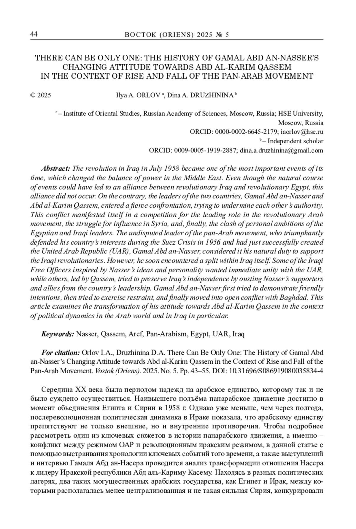 Середина XX века была периодом надежд на арабское единство, которому так и не было суждено осуществиться. Наивысшего подъёма панарабское движение достигло в момент объединения Египта и Сирии в 1958 г. Однако уже меньше, чем через полгода, послереволюционная политическая динамика в Ираке показала, что арабскому единству препятствуют не только внешние, но и внутренние противоречия. Чтобы подробнее рассмотреть один из ключевых сюжетов в истории панарабского движения, а именно – конфликт между режимом ОАР и революционным иракским режимом, в данной статье с помощью выстраивания хронологии ключевых событий того времени, а также выступлений и интервью Гамаля Абд ан-Насера проводится анализ трансформации отношения Насера к лидеру Иракской республики Абд аль-Кариму Касему.