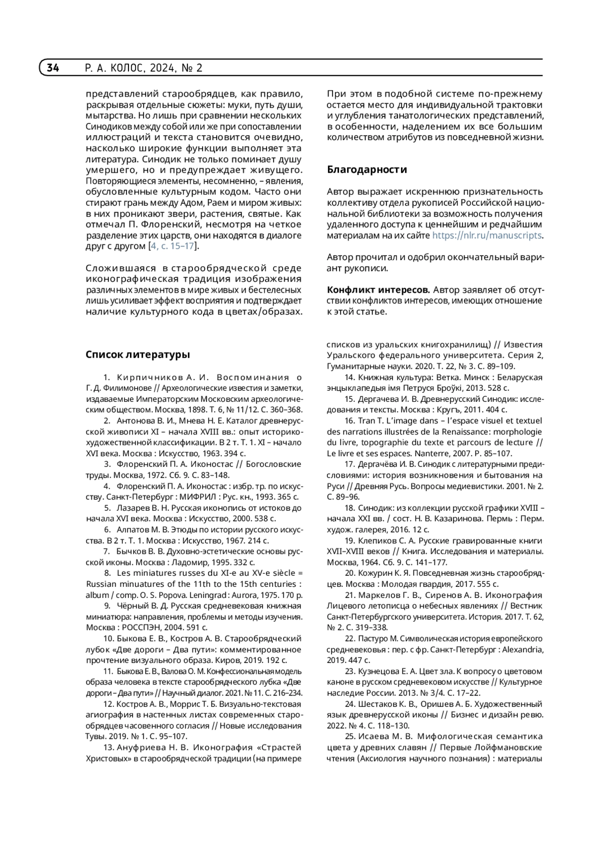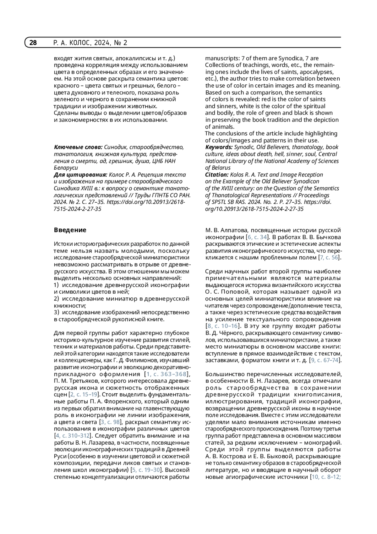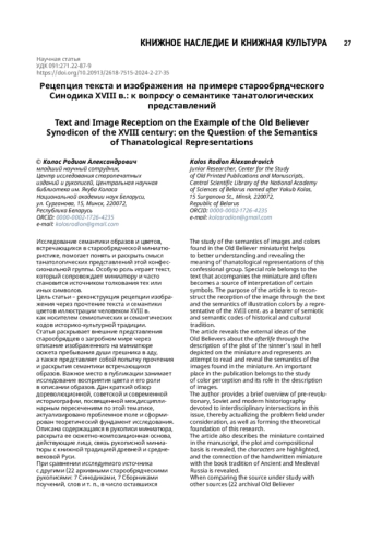 КОЛОС Р. А. РЕЦЕПЦИЯ ТЕКСТА И ИЗОБРАЖЕНИЯ НА ПРИМЕРЕ СТАРООБРЯДЧЕСКОГО СИНОДИКА XVIII В.: К ВОПРОСУ О СЕМАНТИКЕ ТАНАТОЛОГИЧЕСКИХ ПРЕДСТАВЛЕНИЙ // ТРУДЫ ГПНТБ СО РАН. 2024. № 2